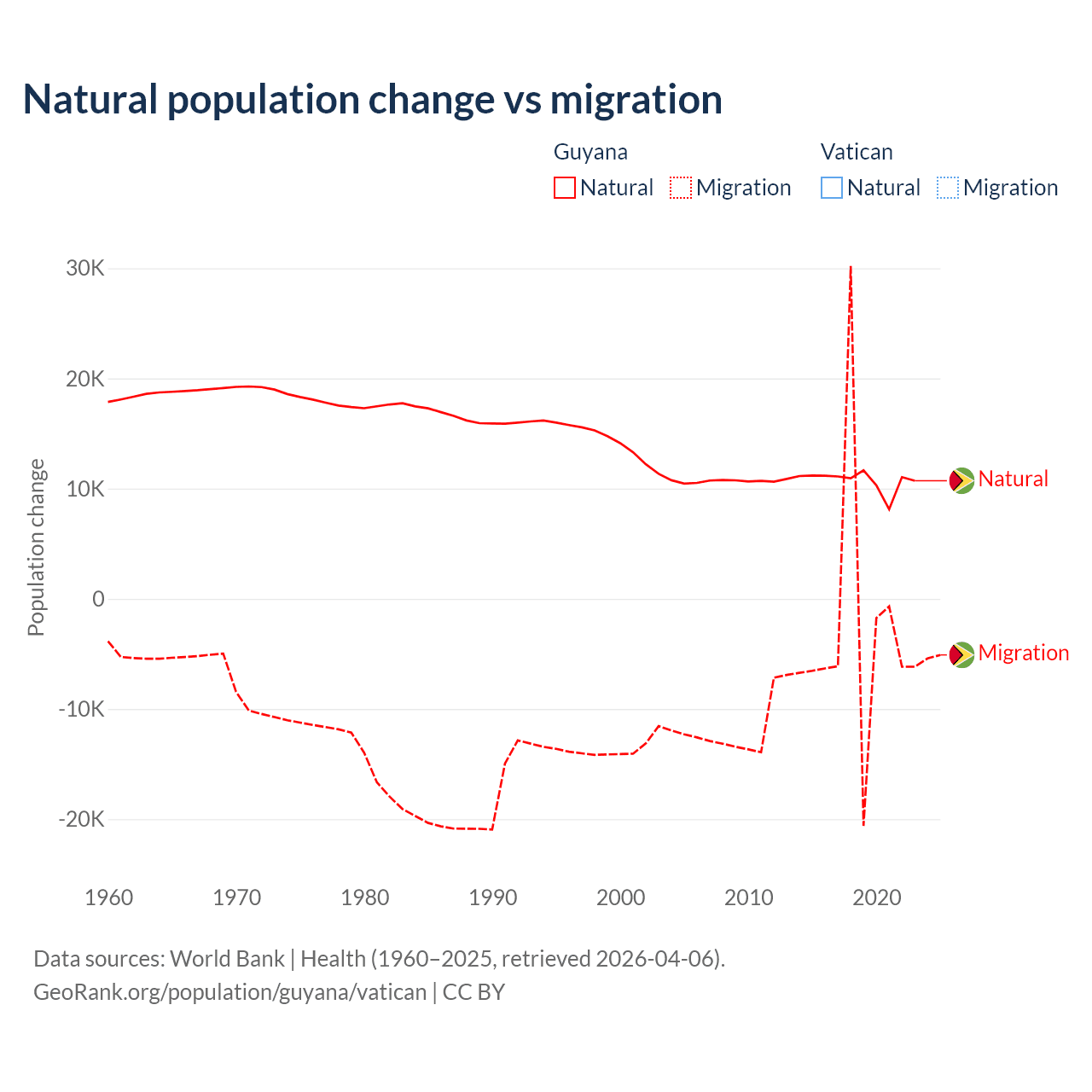 - For the last 10 years, Guyana has had an average growth rate of +0.94% per year vs +1.9% in the Vatican.