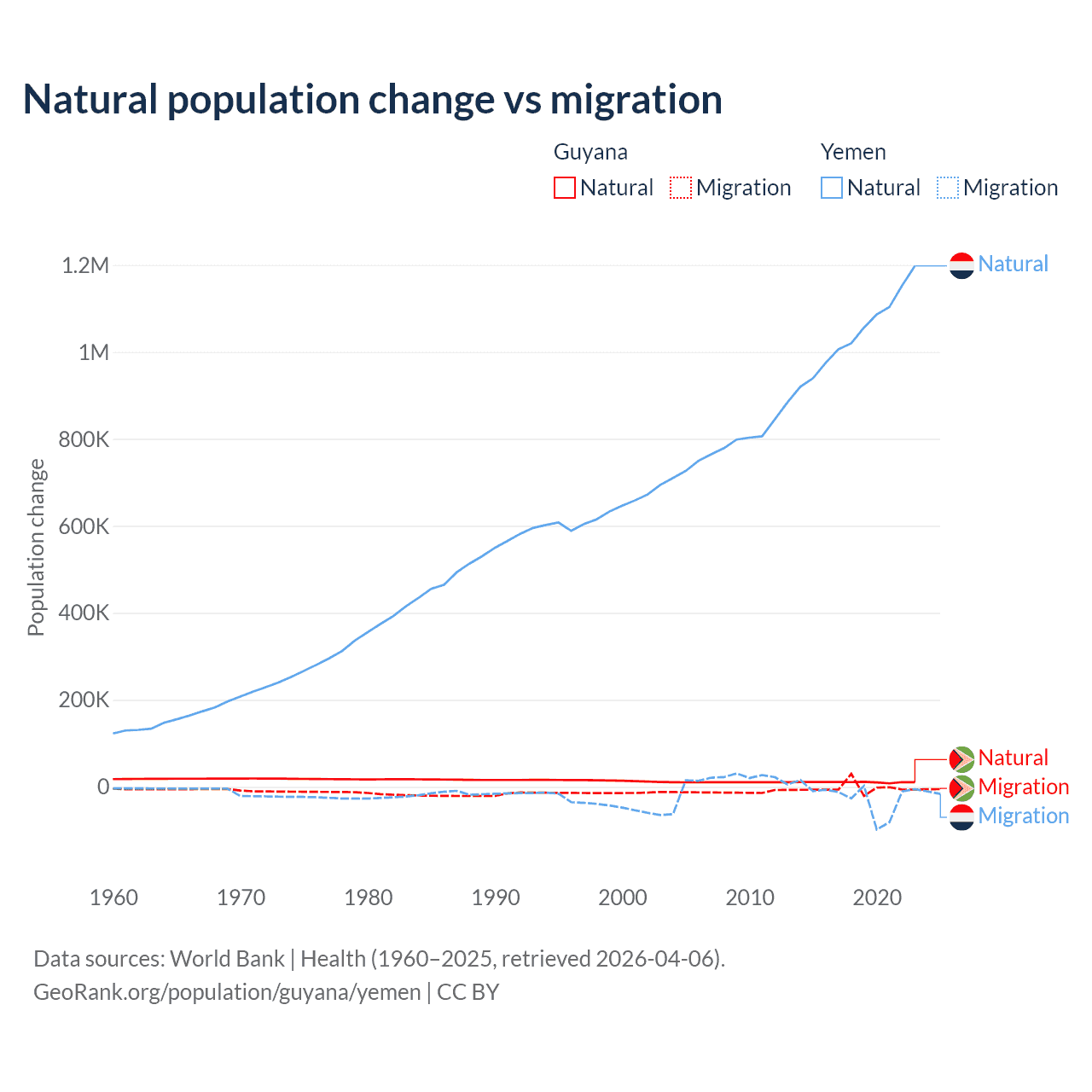 Over the last 10 years, 77.7% of the population change in Guyana is from natural causes (a gain of 107,419 people) and 22.3% is from migration (a loss of 30,797 people). In Yemen 97.8% is from natural causes (a gain of 10,460,813 people) and 2.17% is from migration (a loss of 231,814 people).