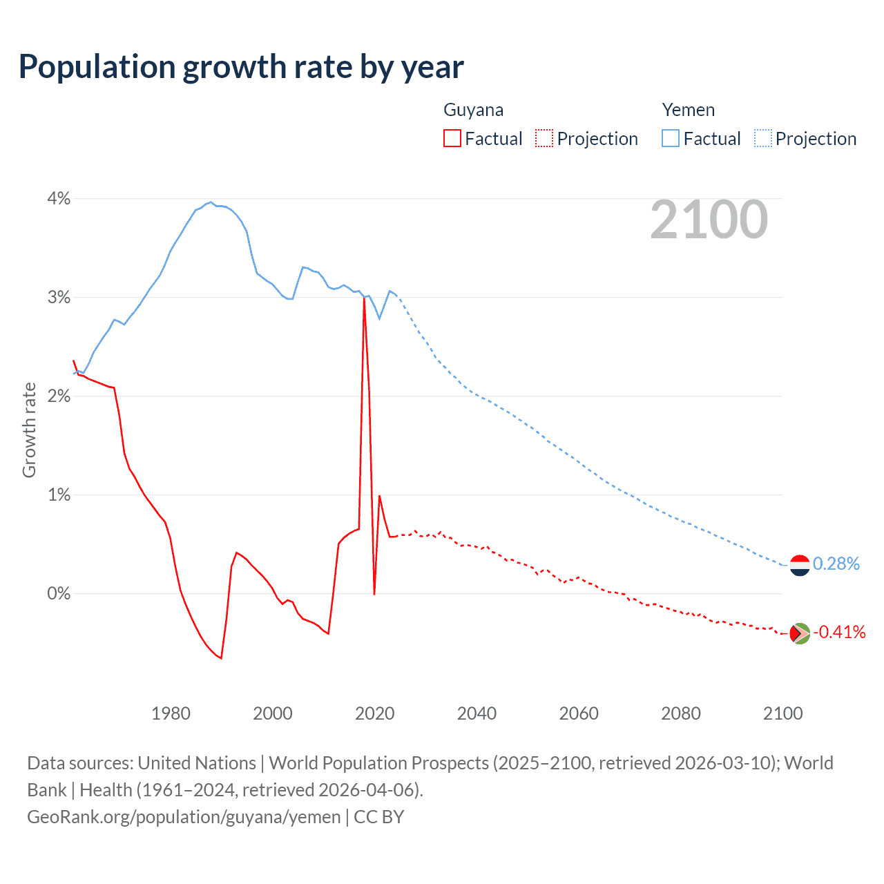 - For the last 10 years, Guyana has had an average growth rate of +0.94% per year vs +3% in Yemen.