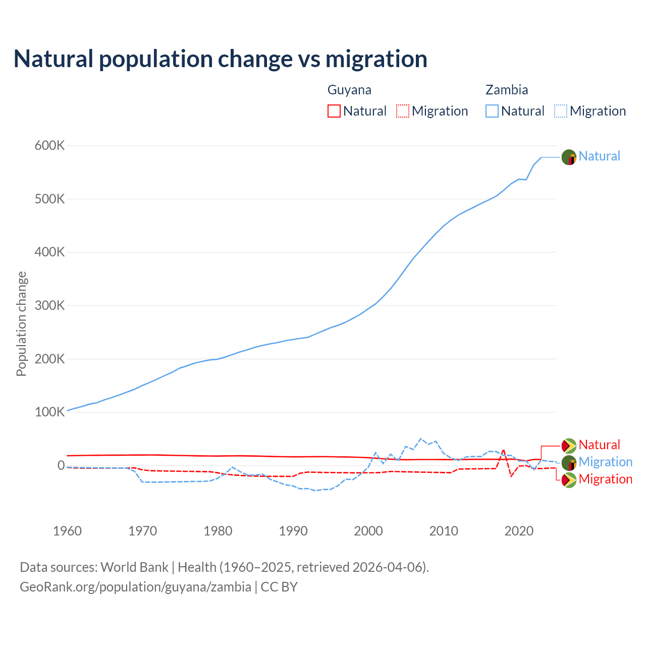 Over the last 10 years, 77.7% of the population change in Guyana is from natural causes (a gain of 107,419 people) and 22.3% is from migration (a loss of 30,797 people). In Zambia 97.4% is from natural causes (a gain of 5,233,797 people) and 2.58% is from migration (a gain of 138,554 people).