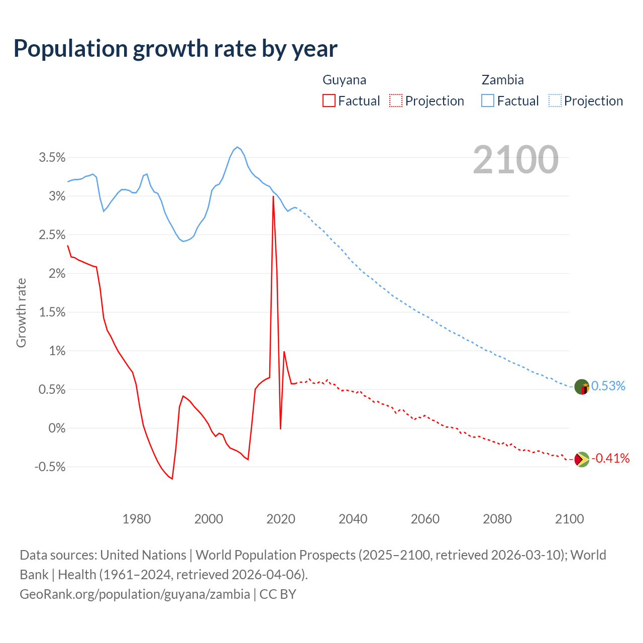 - For the last 10 years, Guyana has had an average growth rate of +0.94% per year vs +3% in Zambia.