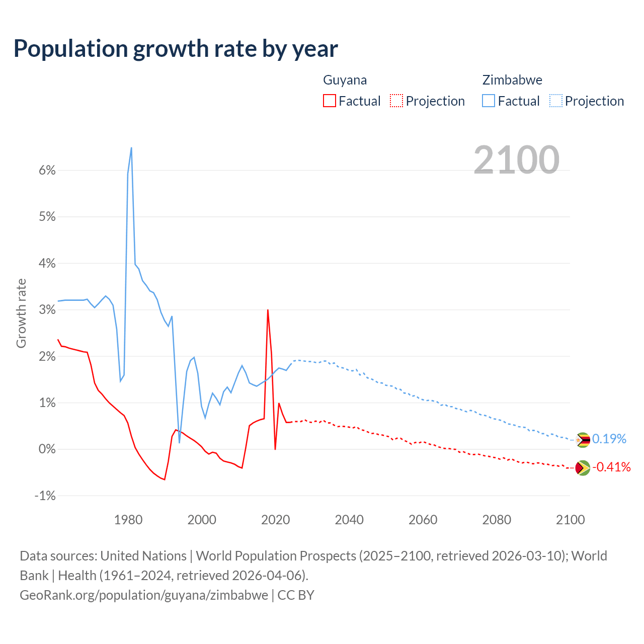 - For the last 10 years, Guyana has had an average growth rate of +0.94% per year vs +1.57% in Zimbabwe.