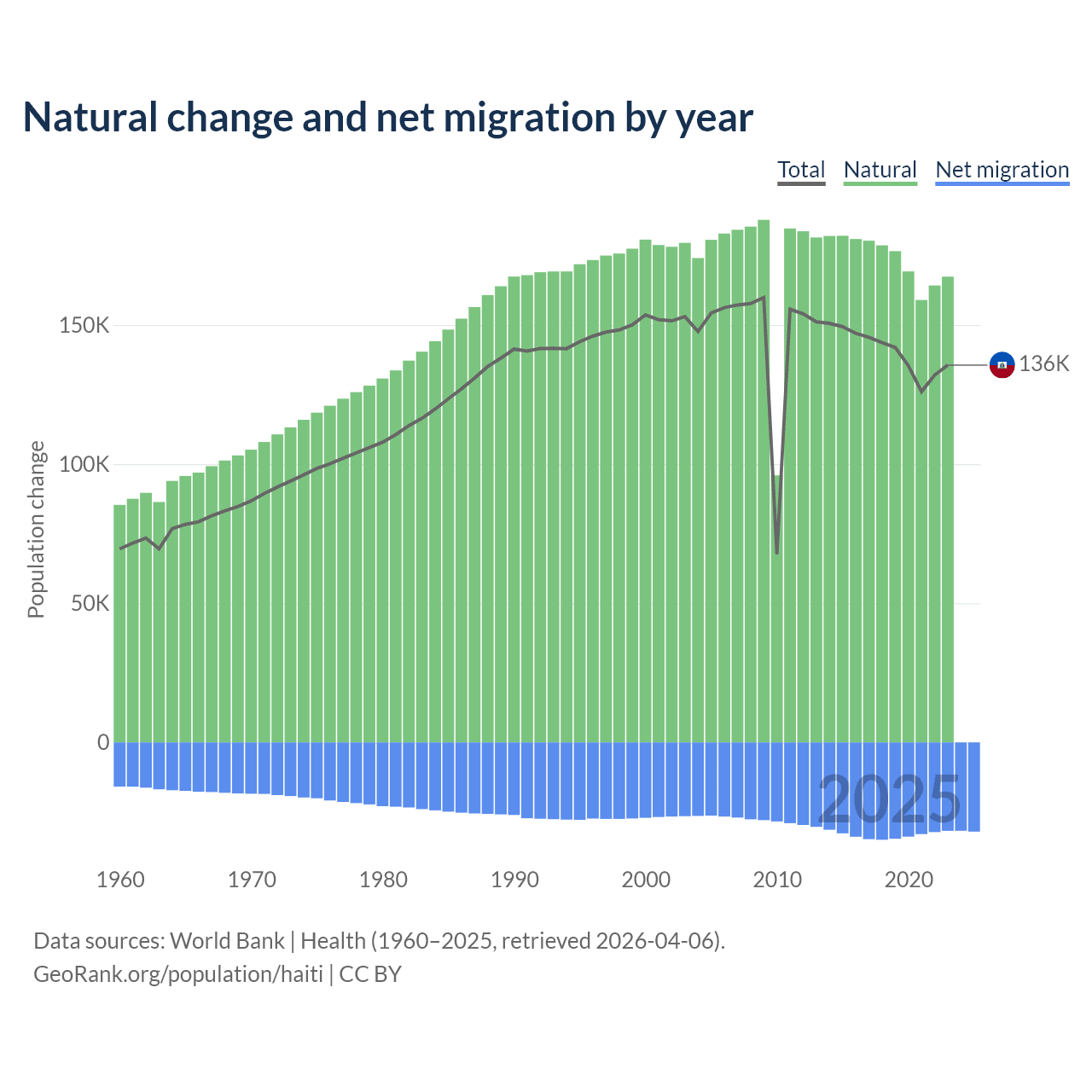 Over the last 10 years, 83.9% of the population change in Haiti is from natural causes (a gain of 1,740,319 people) and 16.1% is from migration (a loss of 333,076 people).