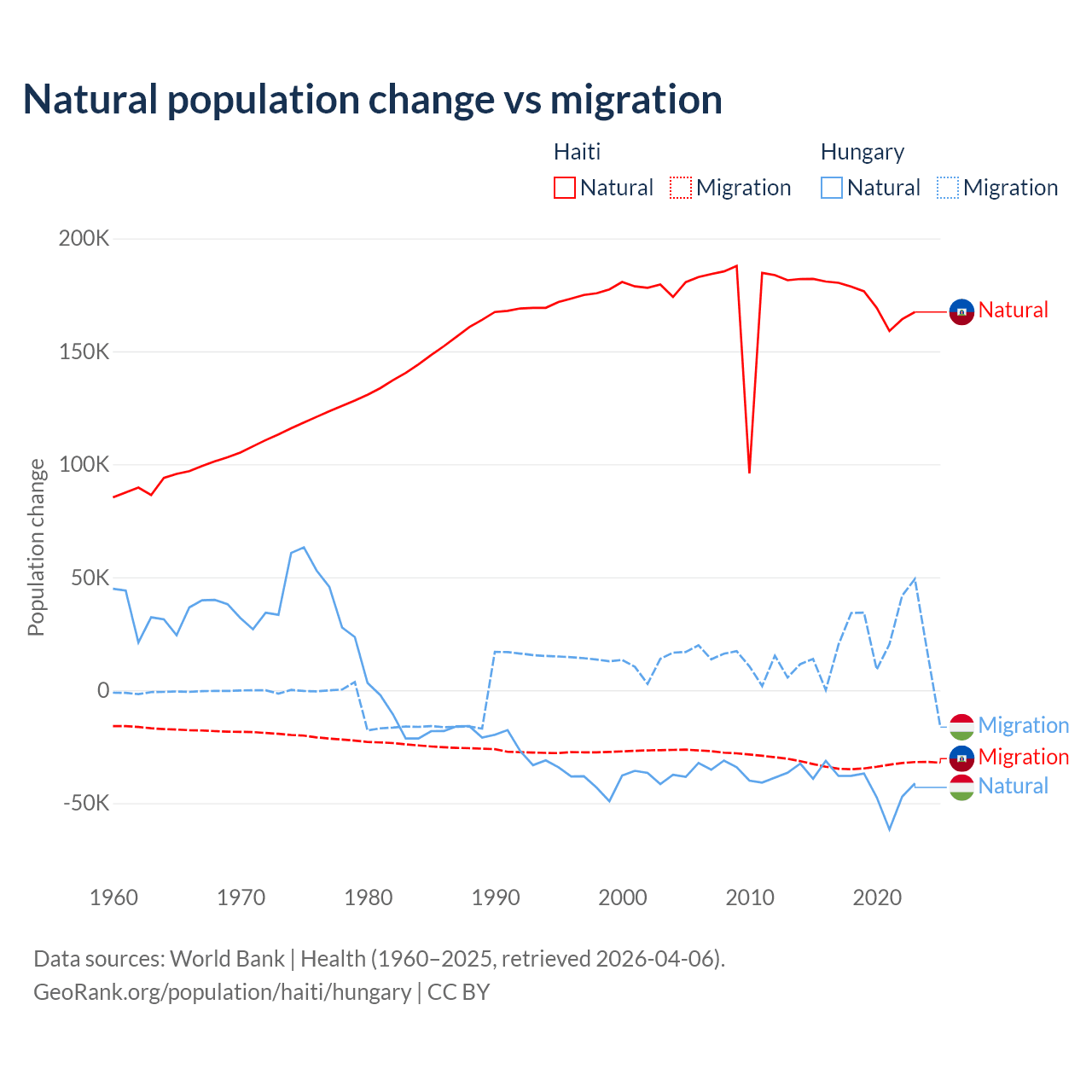 Over the last 10 years, 83.9% of the population change in Haiti is from natural causes (a gain of 1,740,319 people) and 16.1% is from migration (a loss of 333,076 people). In Hungary 63.7% is from natural causes (a loss of 412,838 people) and 36.3% is from migration (a gain of 234,837 people).