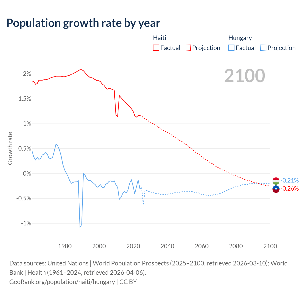 - For the last 10 years, Haiti has had an average growth rate of +1.29% per year vs -0.29% in Hungary.