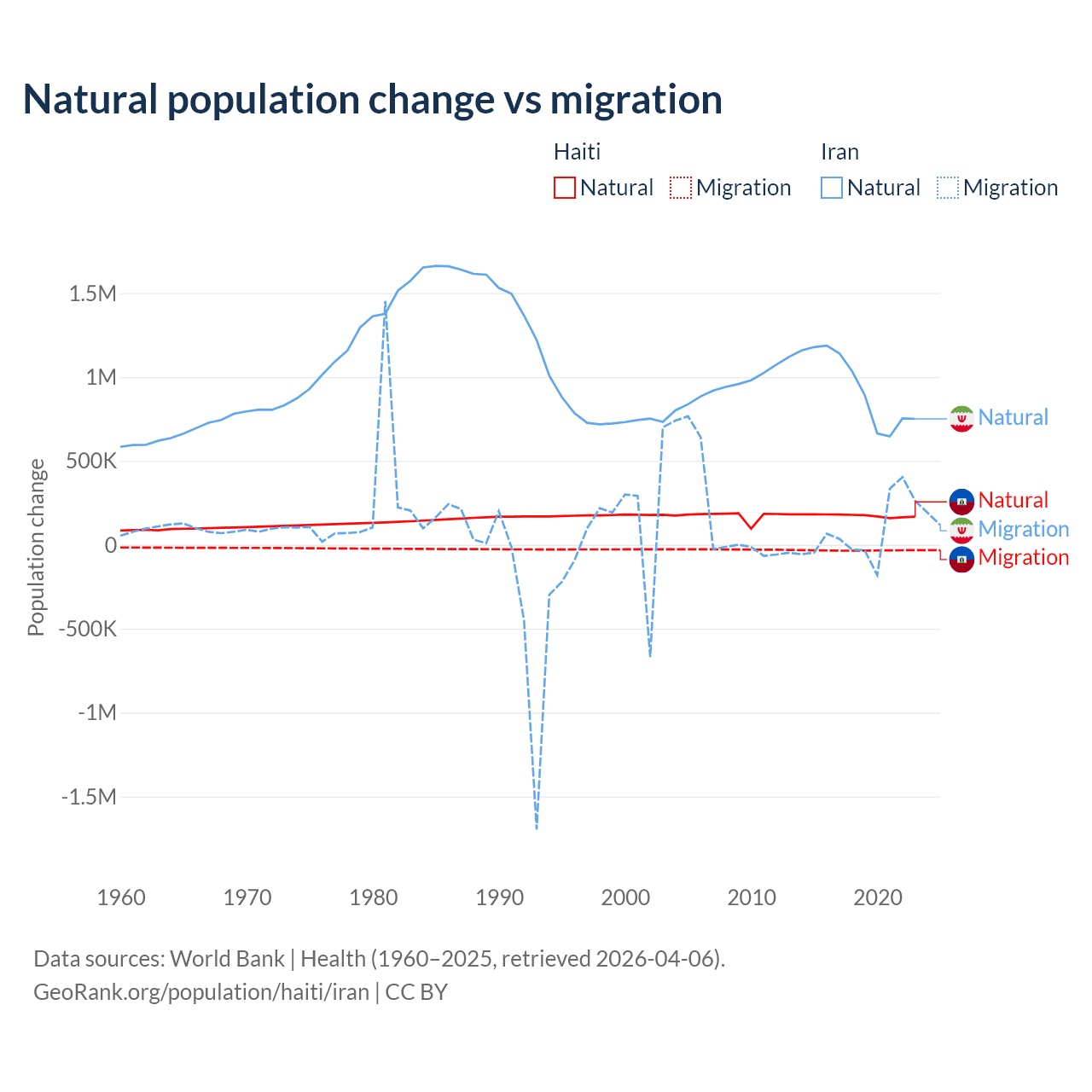 Over the last 10 years, 83.9% of the population change in Haiti is from natural causes (a gain of 1,740,319 people) and 16.1% is from migration (a loss of 333,076 people). In Iran 92.5% is from natural causes (a gain of 9,405,860 people) and 7.46% is from migration (a gain of 757,979 people).