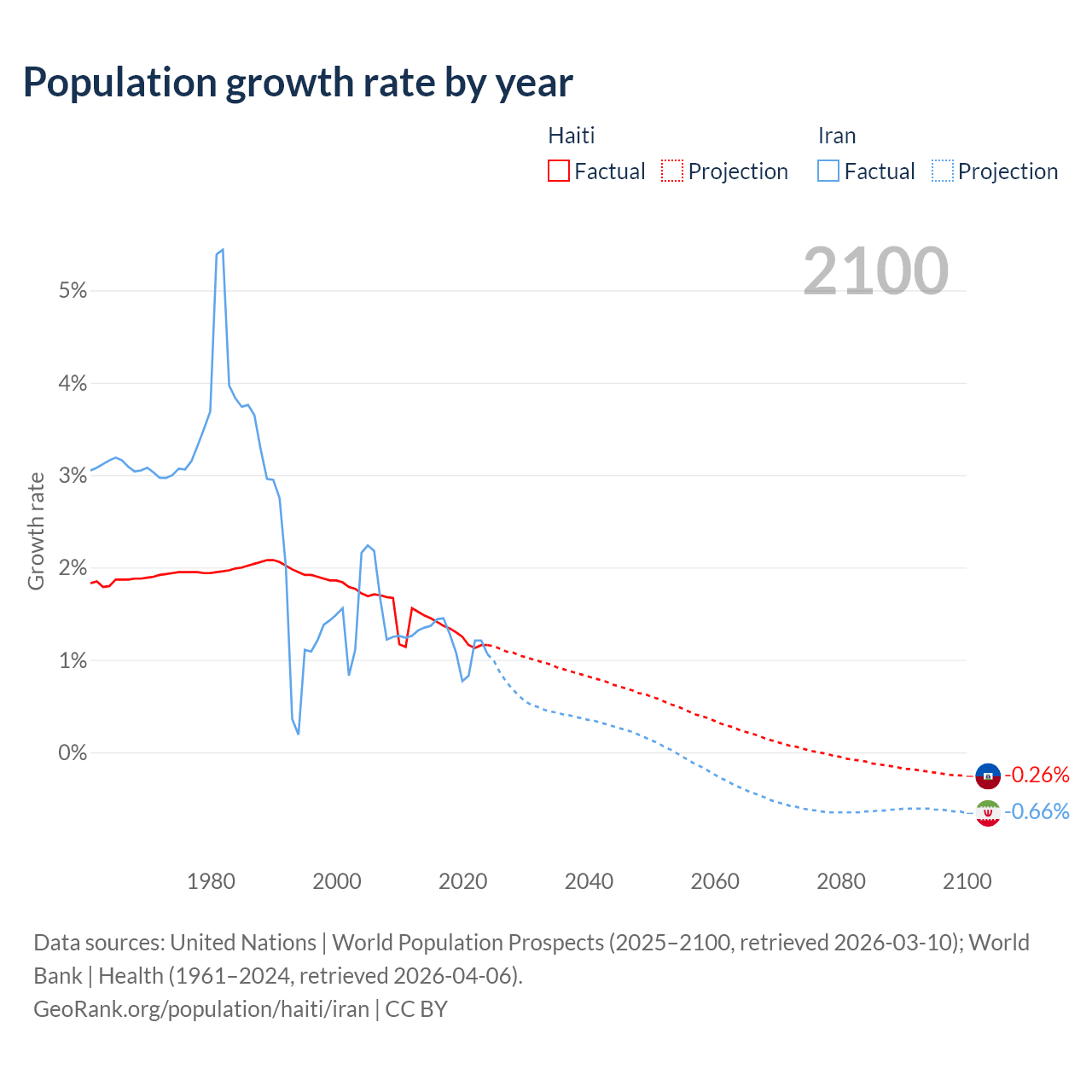 - For the last 10 years, Haiti has had an average growth rate of +1.29% per year vs +1.19% in Iran.