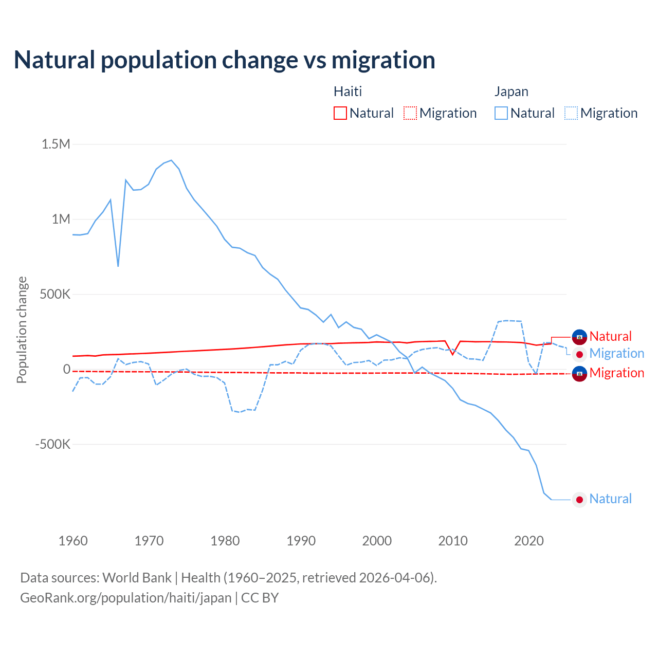 Over the last 10 years, 83.9% of the population change in Haiti is from natural causes (a gain of 1,740,319 people) and 16.1% is from migration (a loss of 333,076 people). In Japan 73.6% is from natural causes (a loss of 5,178,838 people) and 26.4% is from migration (a gain of 1,860,103 people).