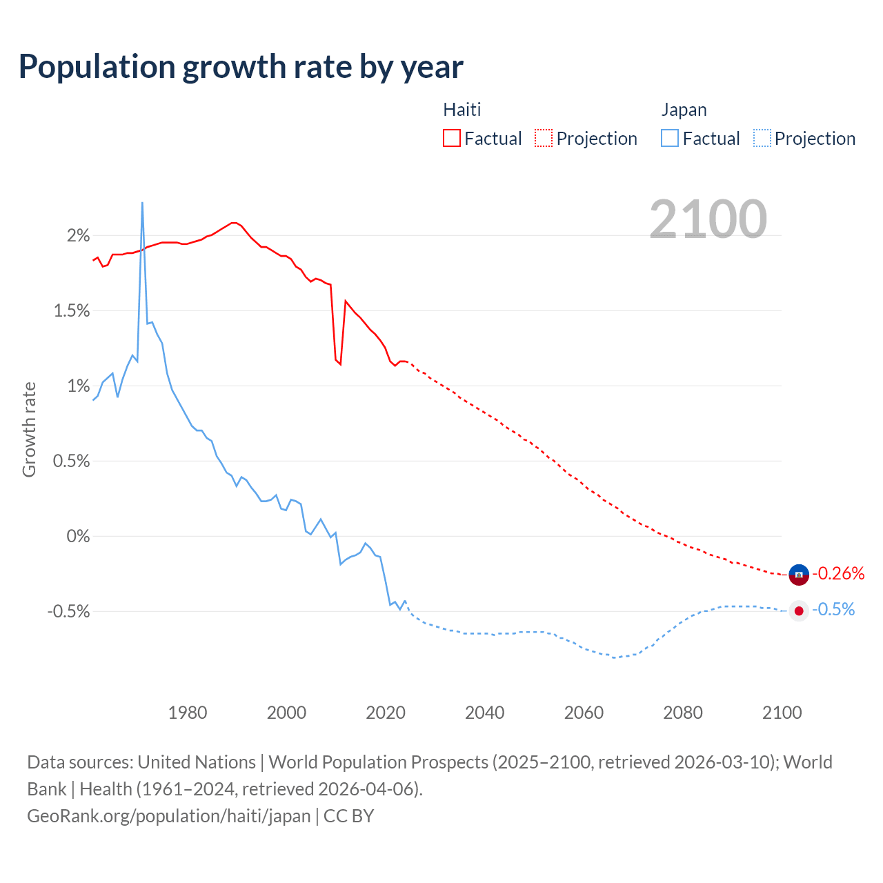 - For the last 10 years, Haiti has had an average growth rate of +1.29% per year vs -0.25% in Japan.