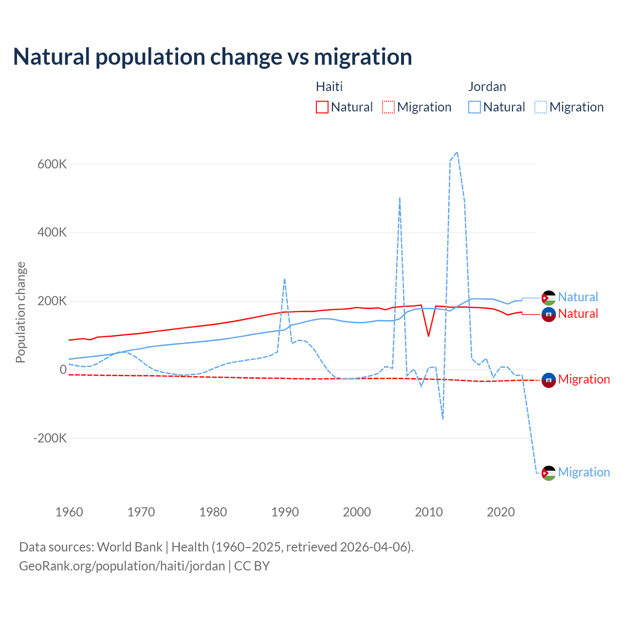 Over the last 10 years, 83.9% of the population change in Haiti is from natural causes (a gain of 1,740,319 people) and 16.1% is from migration (a loss of 333,076 people). In Jordan 63.2% is from natural causes (a gain of 1,991,452 people) and 36.8% is from migration (a gain of 1,157,625 people).
