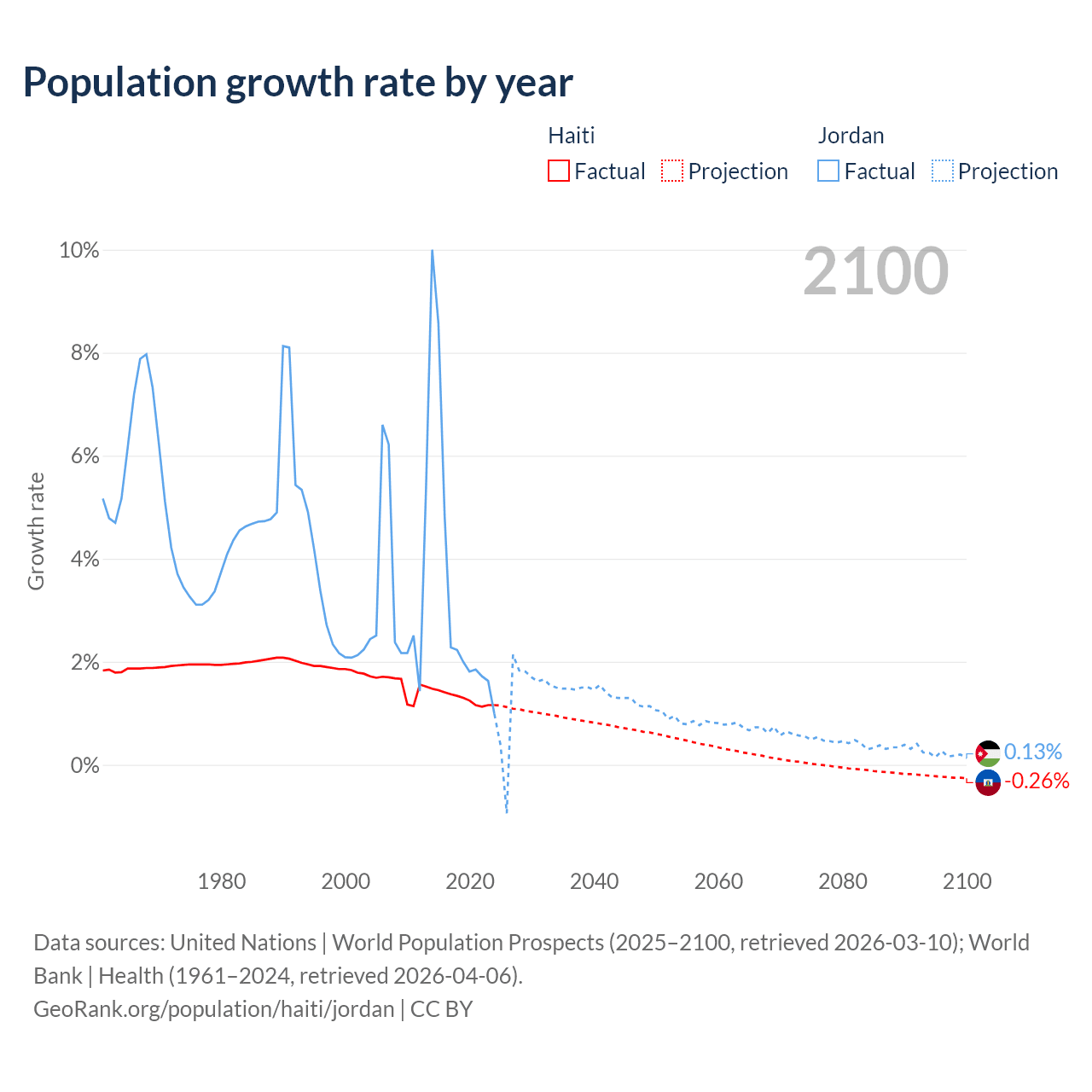 - For the last 10 years, Haiti has had an average growth rate of +1.29% per year vs +3.45% in Jordan.