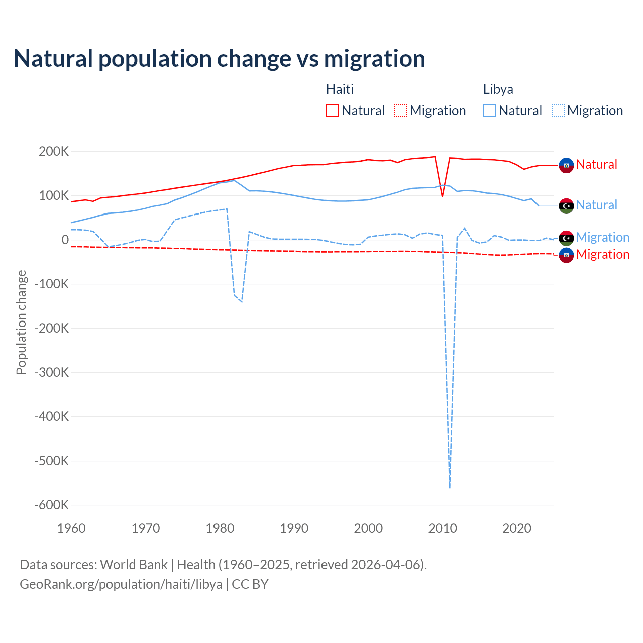 Over the last 10 years, 83.9% of the population change in Haiti is from natural causes (a gain of 1,740,319 people) and 16.1% is from migration (a loss of 333,076 people). In Libya 99.4% is from natural causes (a gain of 975,799 people) and 0.63% is from migration (a loss of 6,150 people).