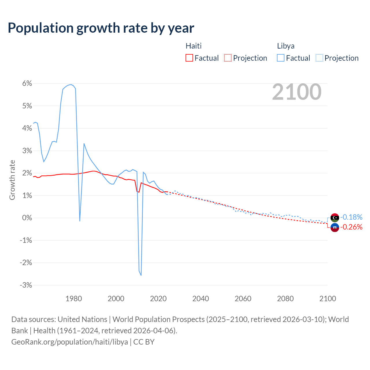 - For the last 10 years, Haiti has had an average growth rate of +1.29% per year vs +1.44% in Libya.