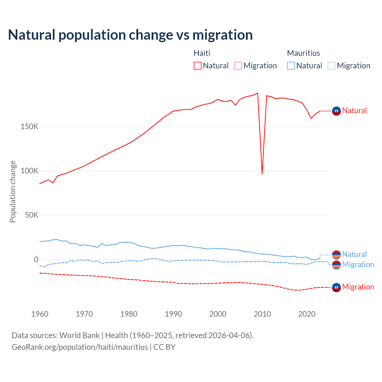 Over the last 10 years, 83.9% of the population change in Haiti is from natural causes (a gain of 1,740,319 people) and 16.1% is from migration (a loss of 333,076 people). In Mauritius 30.9% is from natural causes (a gain of 19,327 people) and 69.1% is from migration (a loss of 43,294 people).
