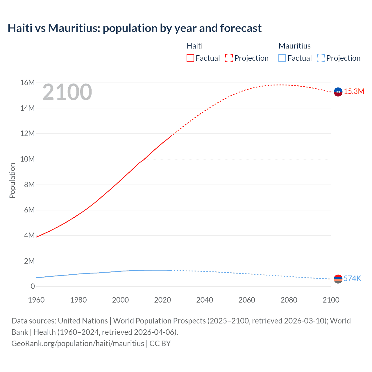 Haiti vs Mauritius: population by year and forecast