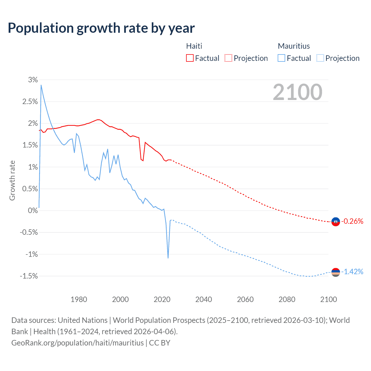 - For the last 10 years, Haiti has had an average growth rate of +1.29% per year vs -0.09% in Mauritius.