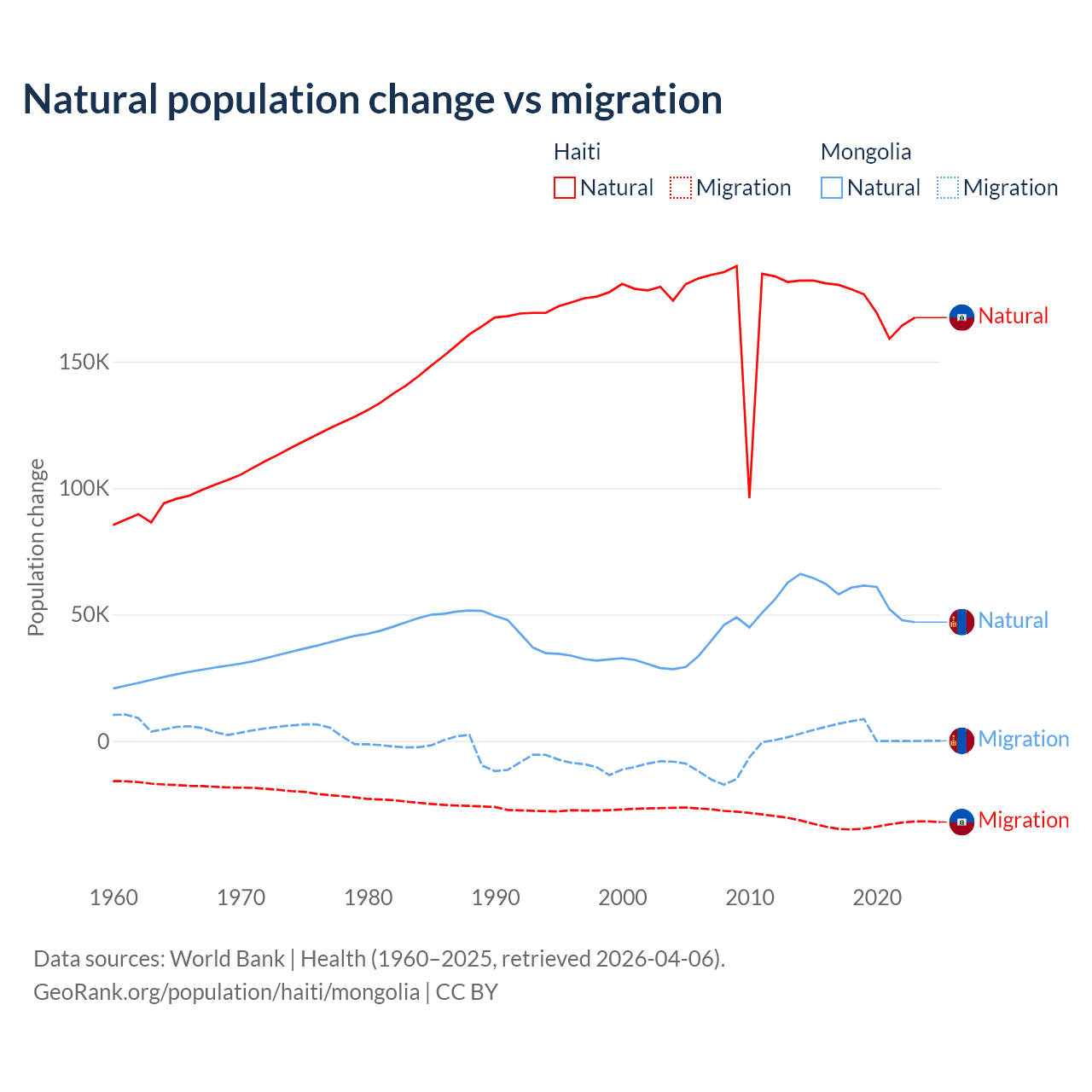 Over the last 10 years, 83.9% of the population change in Haiti is from natural causes (a gain of 1,740,319 people) and 16.1% is from migration (a loss of 333,076 people). In Mongolia 94.1% is from natural causes (a gain of 580,367 people) and 5.87% is from migration (a gain of 36,163 people).