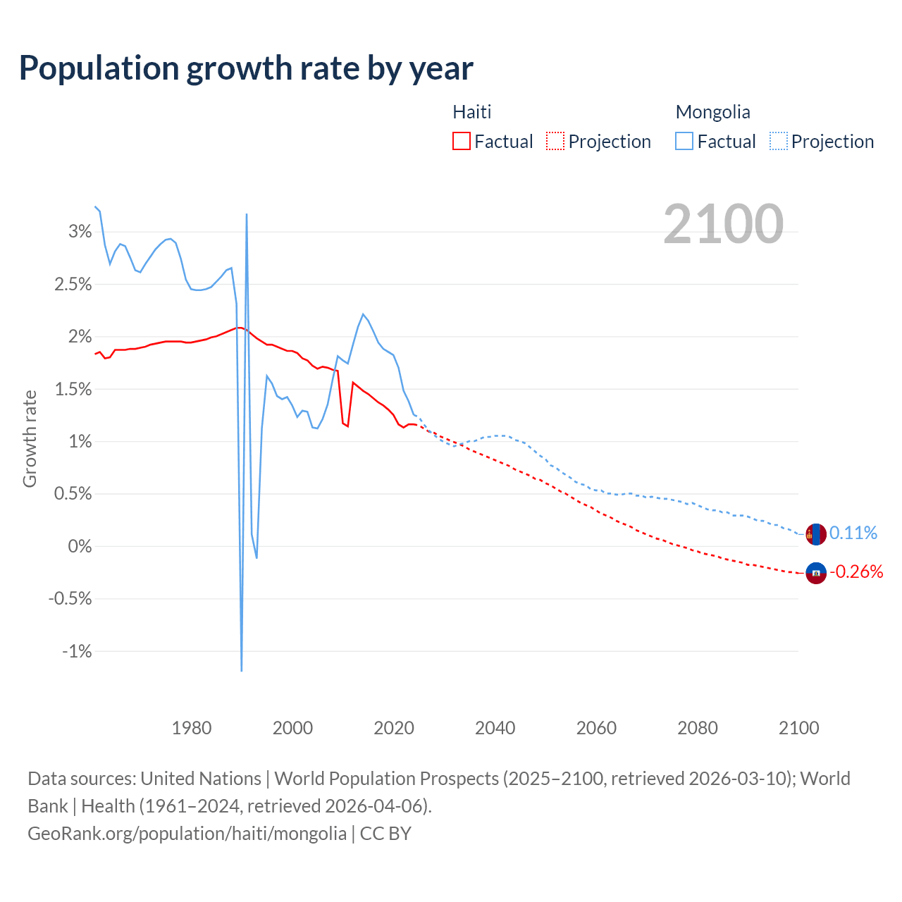 - For the last 10 years, Haiti has had an average growth rate of +1.29% per year vs +1.79% in Mongolia.