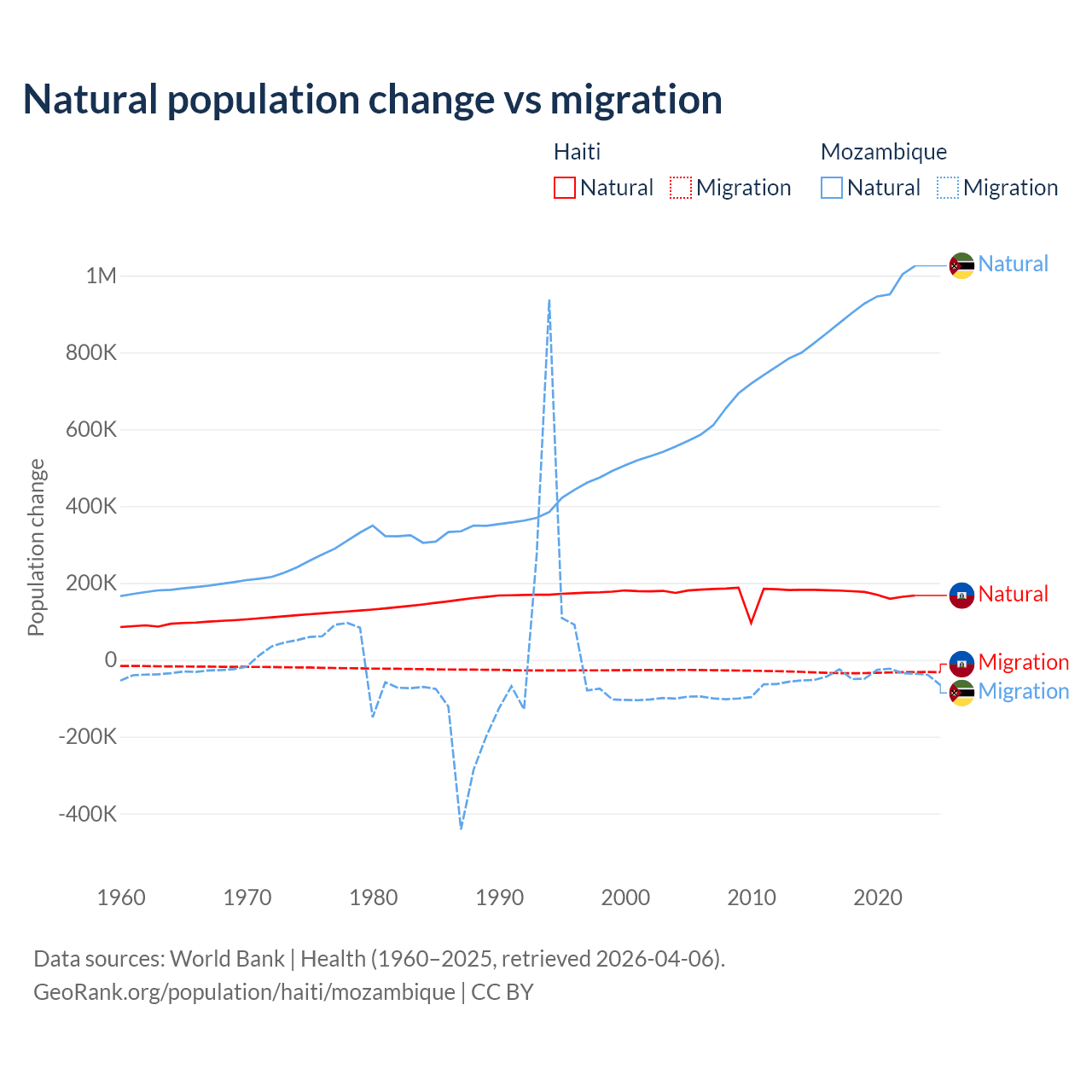 Over the last 10 years, 83.9% of the population change in Haiti is from natural causes (a gain of 1,740,319 people) and 16.1% is from migration (a loss of 333,076 people). In Mozambique 95.9% is from natural causes (a gain of 9,108,203 people) and 4.15% is from migration (a loss of 393,923 people).