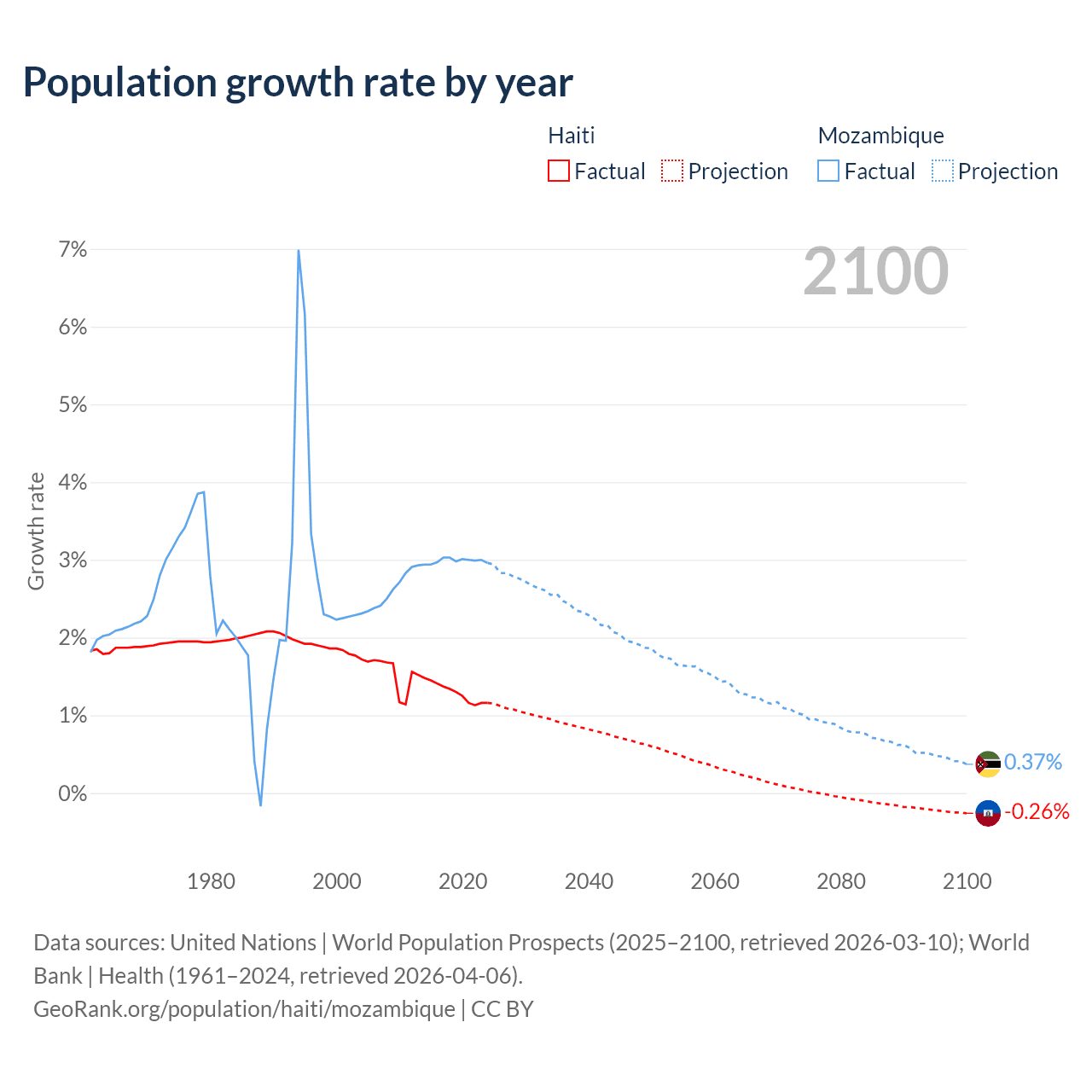- For the last 10 years, Haiti has had an average growth rate of +1.29% per year vs +2.99% in Mozambique.
