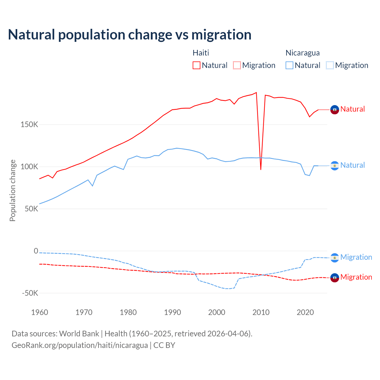 Over the last 10 years, 83.9% of the population change in Haiti is from natural causes (a gain of 1,740,319 people) and 16.1% is from migration (a loss of 333,076 people). In Nicaragua 85.5% is from natural causes (a gain of 1,017,084 people) and 14.5% is from migration (a loss of 172,078 people).