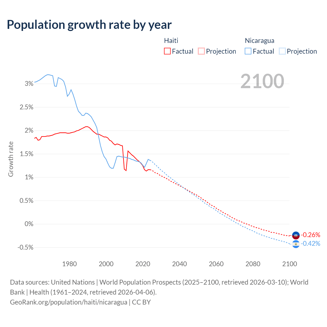 - For the last 10 years, Haiti has had an average growth rate of +1.29% per year vs +1.33% in Nicaragua.