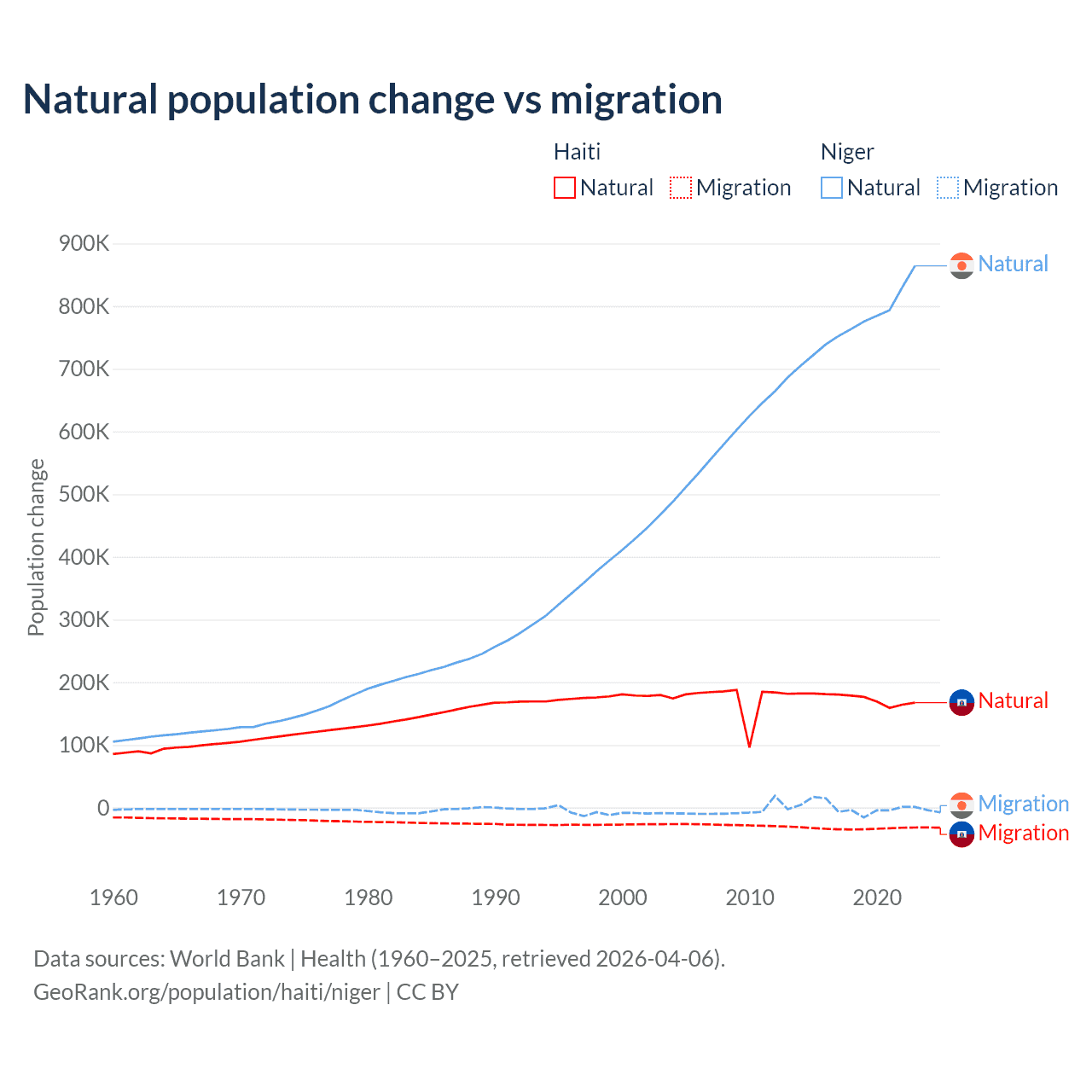 Over the last 10 years, 83.9% of the population change in Haiti is from natural causes (a gain of 1,740,319 people) and 16.1% is from migration (a loss of 333,076 people). In Niger 100% is from natural causes (a gain of 7,728,287 people) and 0.03% is from migration (a gain of 2,520 people).