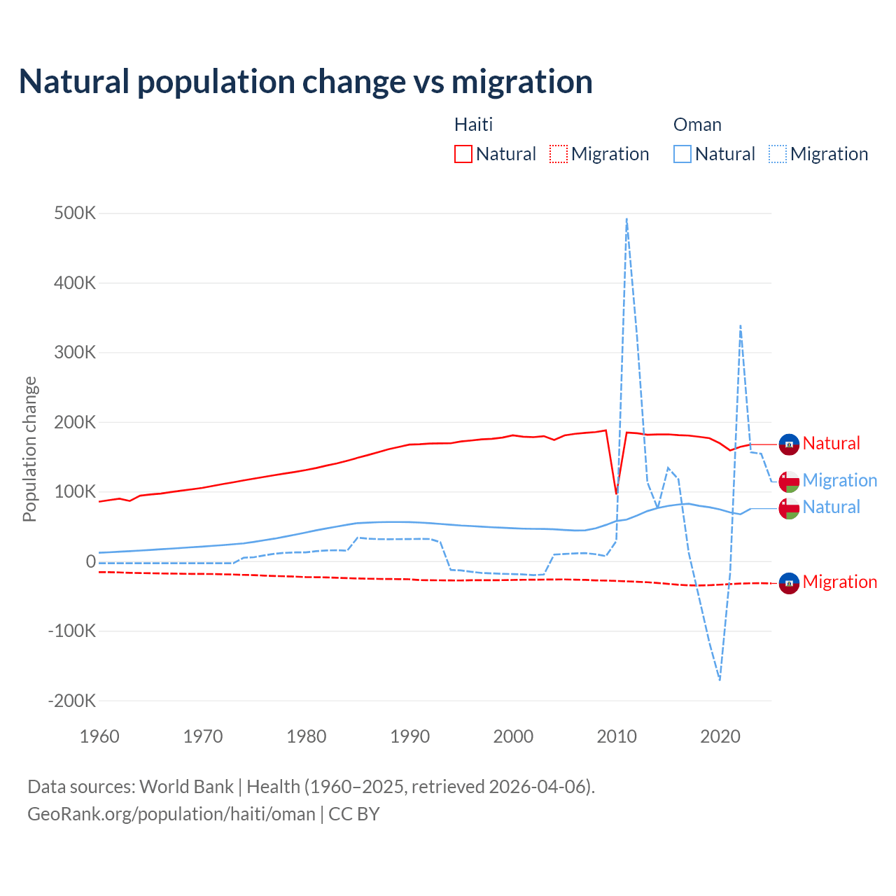Over the last 10 years, 83.9% of the population change in Haiti is from natural causes (a gain of 1,740,319 people) and 16.1% is from migration (a loss of 333,076 people). In Oman 61.6% is from natural causes (a gain of 763,049 people) and 38.4% is from migration (a gain of 475,565 people).