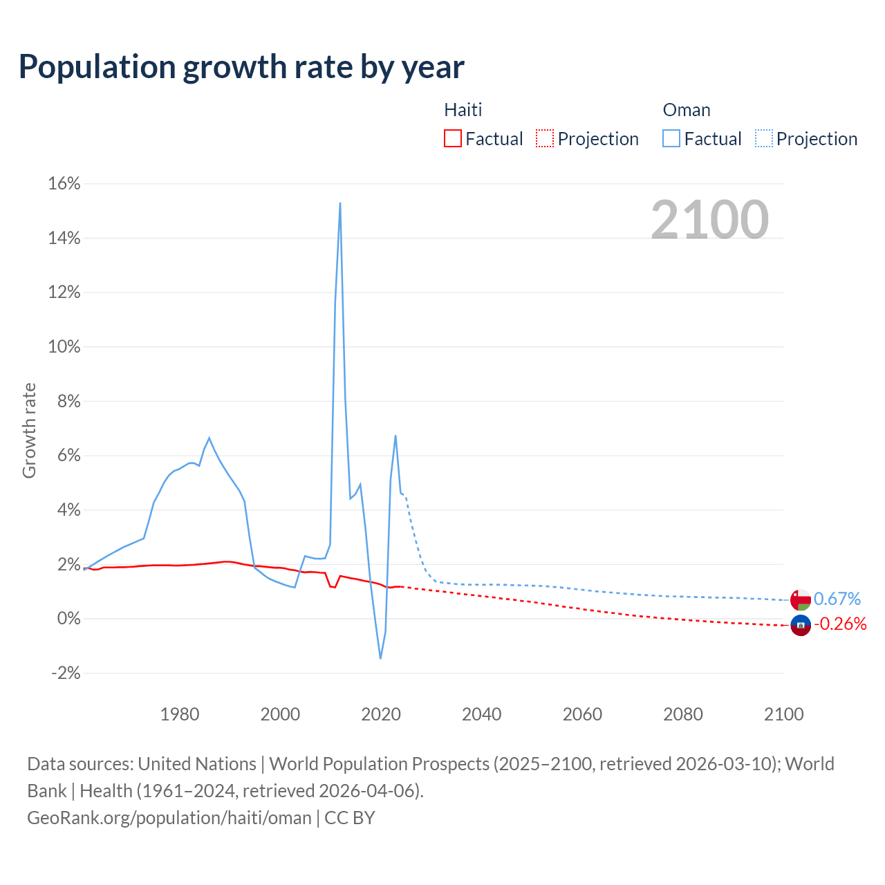 - For the last 10 years, Haiti has had an average growth rate of +1.29% per year vs +2.99% in Oman.