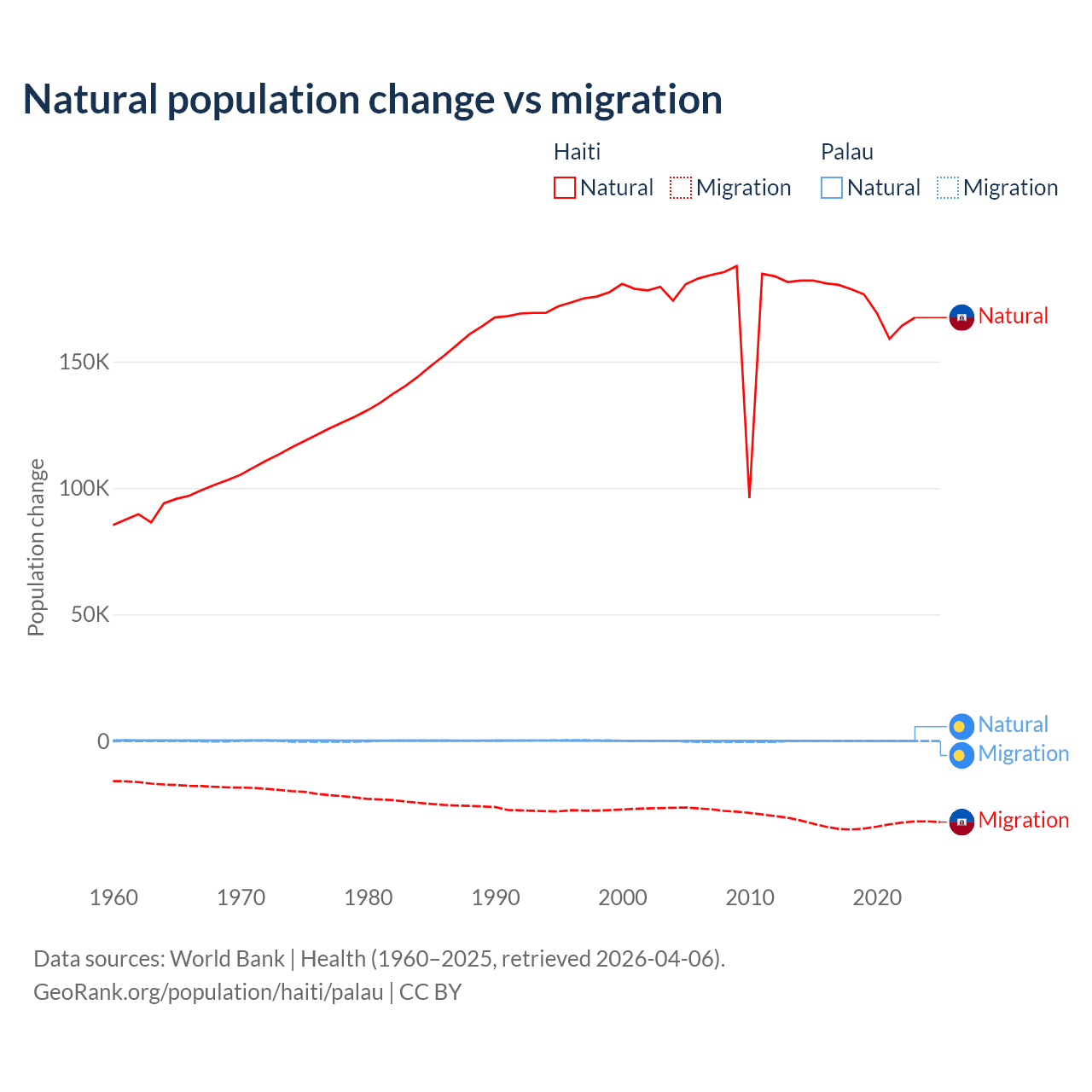 Over the last 10 years, 83.9% of the population change in Haiti is from natural causes (a gain of 1,740,319 people) and 16.1% is from migration (a loss of 333,076 people). In Palau 53.8% is from natural causes (a gain of 264 people) and 46.2% is from migration (a loss of 227 people).