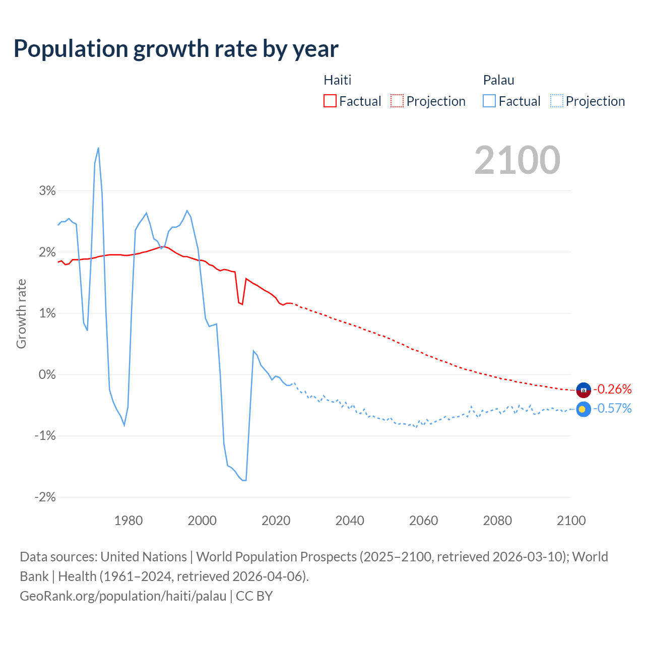 - For the last 10 years, Haiti has had an average growth rate of +1.29% per year vs +0.02% in Palau.