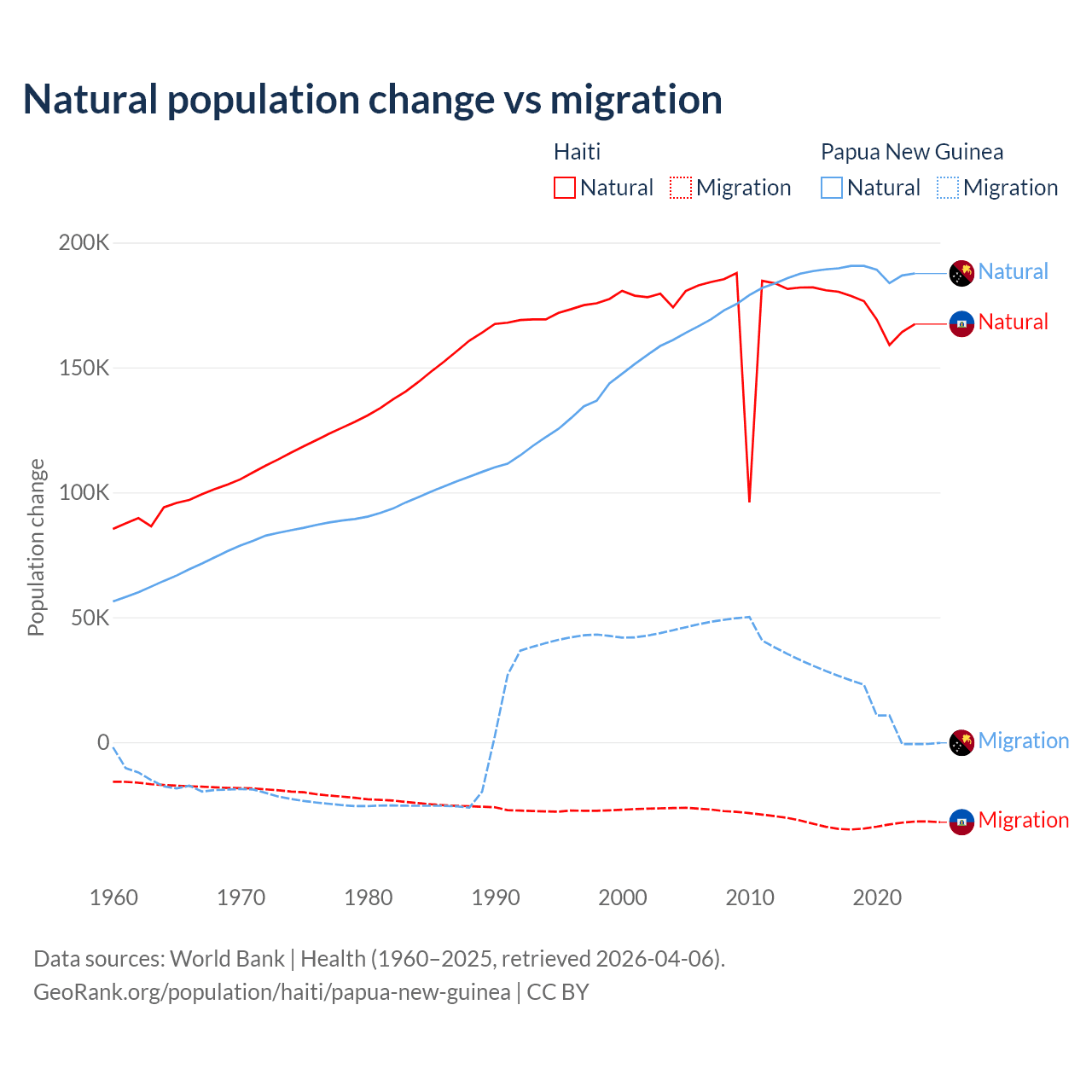Over the last 10 years, 83.9% of the population change in Haiti is from natural causes (a gain of 1,740,319 people) and 16.1% is from migration (a loss of 333,076 people). In Papua New Guinea 91% is from natural causes (a gain of 1,883,906 people) and 8.98% is from migration (a gain of 185,900 people).