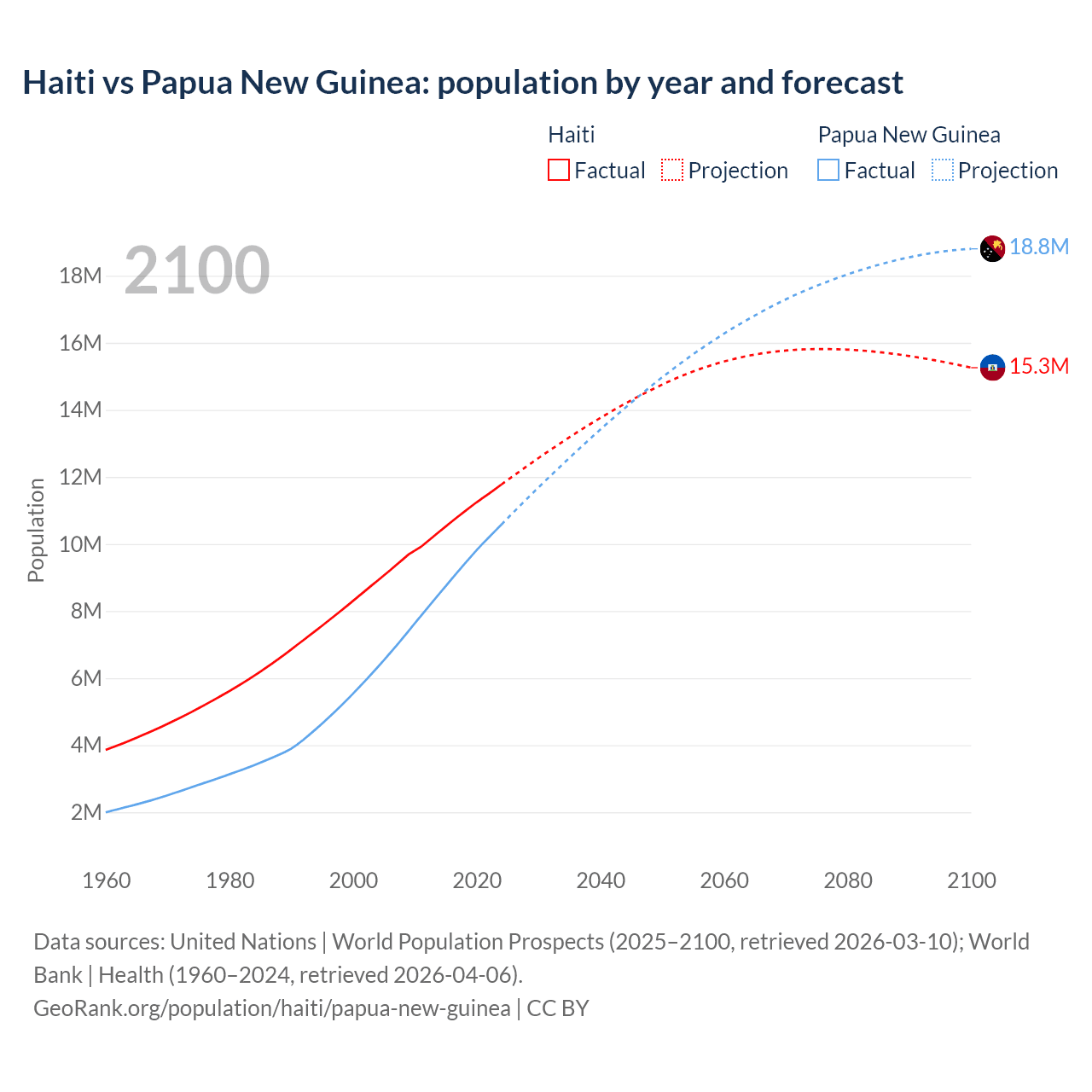 The latest officially reported population of Haiti was 11,772,557 in 2024 vs 10,576,502 people in Papua New Guinea in 2024. In 2026, based on the adjusted UN estimation, the current Haiti's population is 12,076,663 people compared to 11,002,753 in Papua New Guinea.