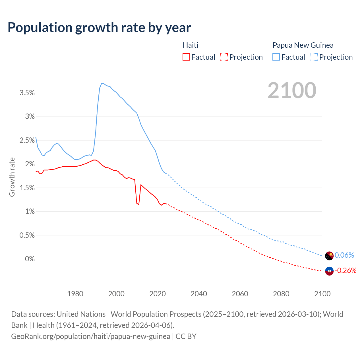 - For the last 10 years, Haiti has had an average growth rate of +1.29% per year vs +2.23% in Papua New Guinea.
