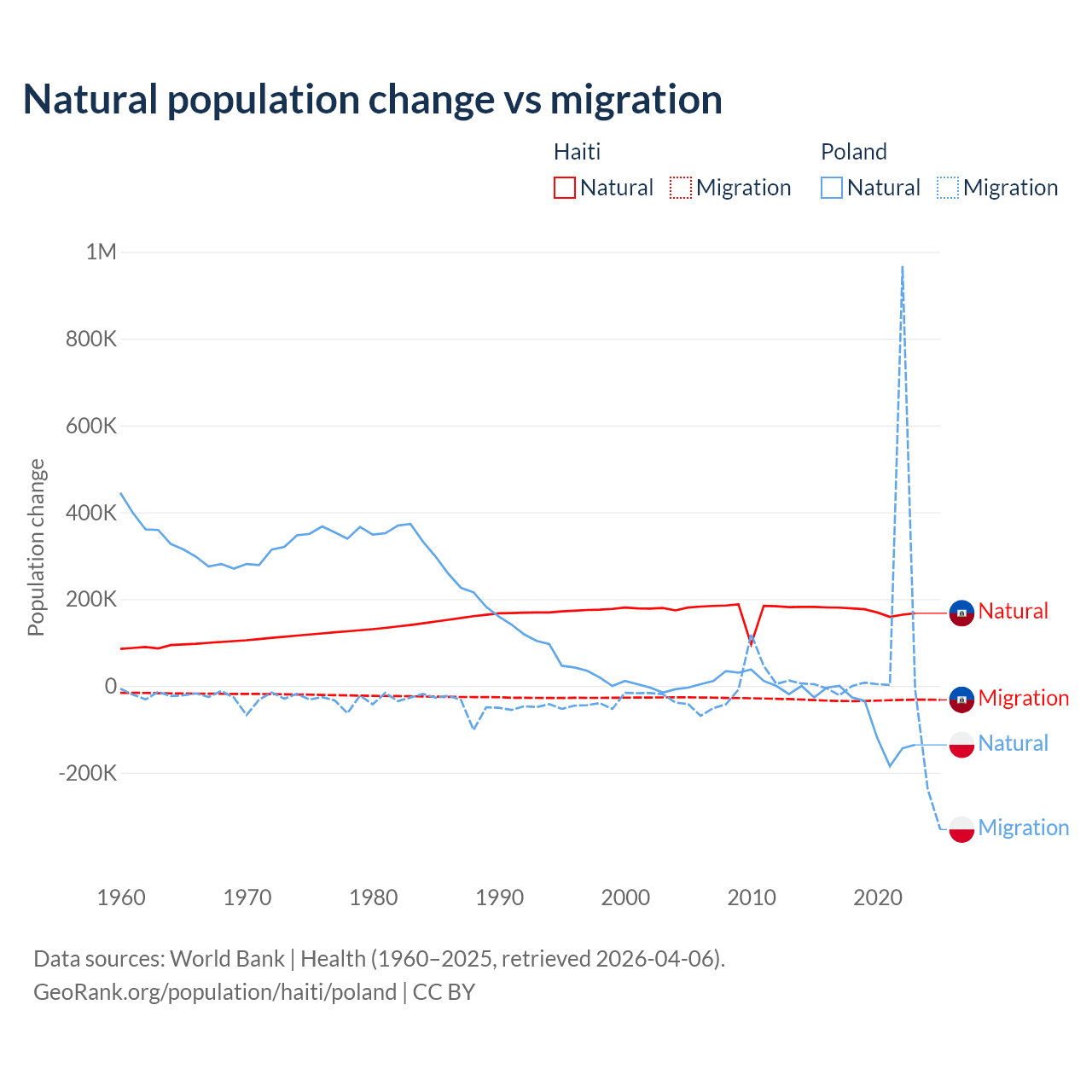 Over the last 10 years, 83.9% of the population change in Haiti is from natural causes (a gain of 1,740,319 people) and 16.1% is from migration (a loss of 333,076 people). In Poland 41.4% is from natural causes (a loss of 675,443 people) and 58.6% is from migration (a gain of 955,766 people).