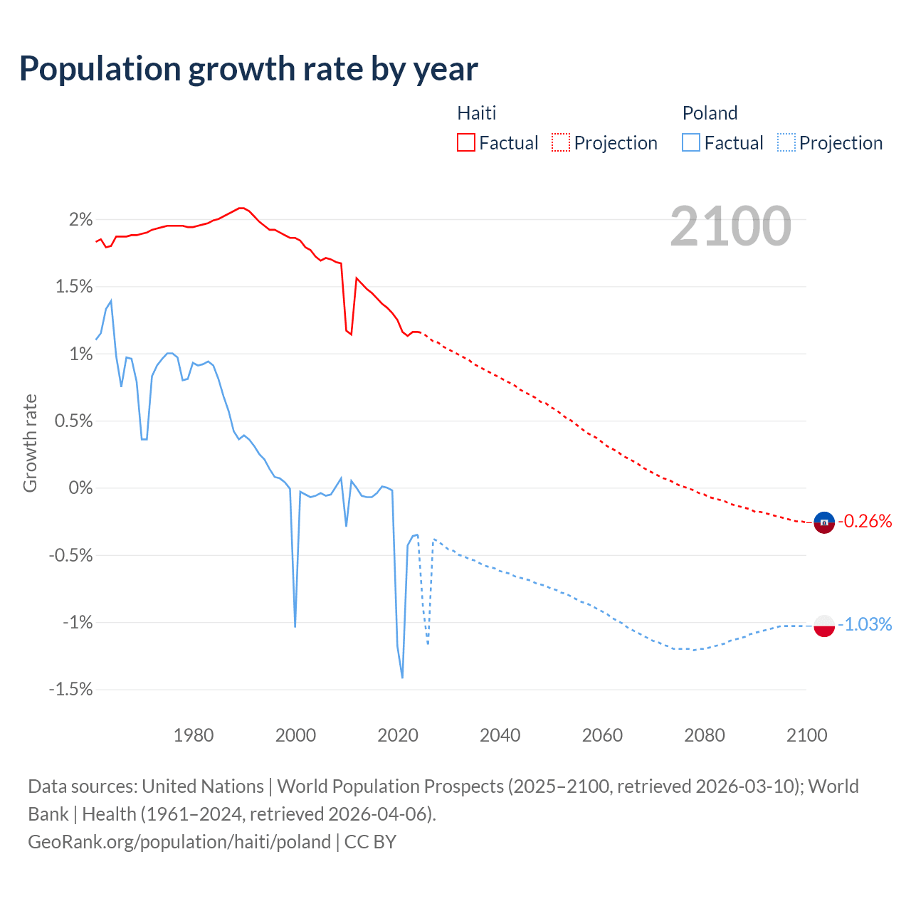 - For the last 10 years, Haiti has had an average growth rate of +1.29% per year vs -0.36% in Poland.