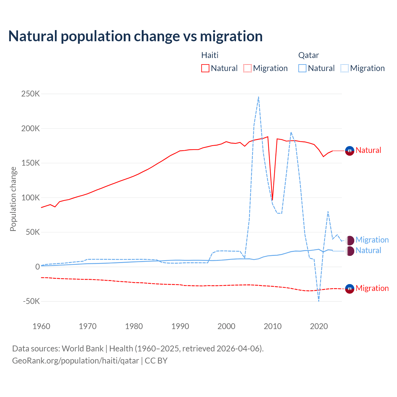 Over the last 10 years, 83.9% of the population change in Haiti is from natural causes (a gain of 1,740,319 people) and 16.1% is from migration (a loss of 333,076 people). In Qatar 26.1% is from natural causes (a gain of 232,009 people) and 73.9% is from migration (a gain of 655,712 people).