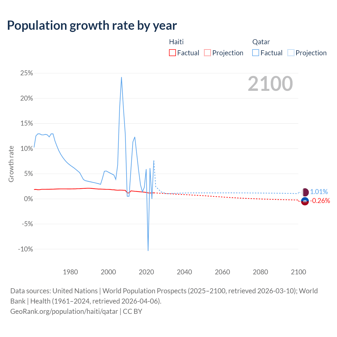 - For the last 10 years, Haiti has had an average growth rate of +1.29% per year vs +3.86% in Qatar.