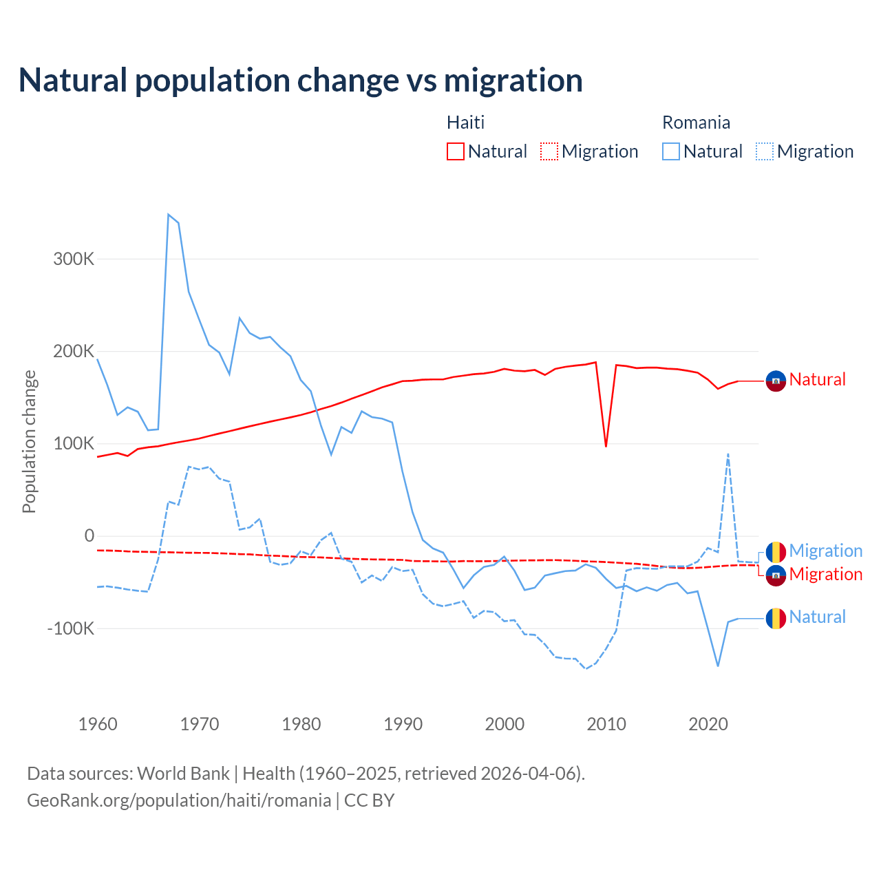 Over the last 10 years, 83.9% of the population change in Haiti is from natural causes (a gain of 1,740,319 people) and 16.1% is from migration (a loss of 333,076 people). In Romania 82% is from natural causes (a loss of 766,295 people) and 18% is from migration (a loss of 167,917 people).