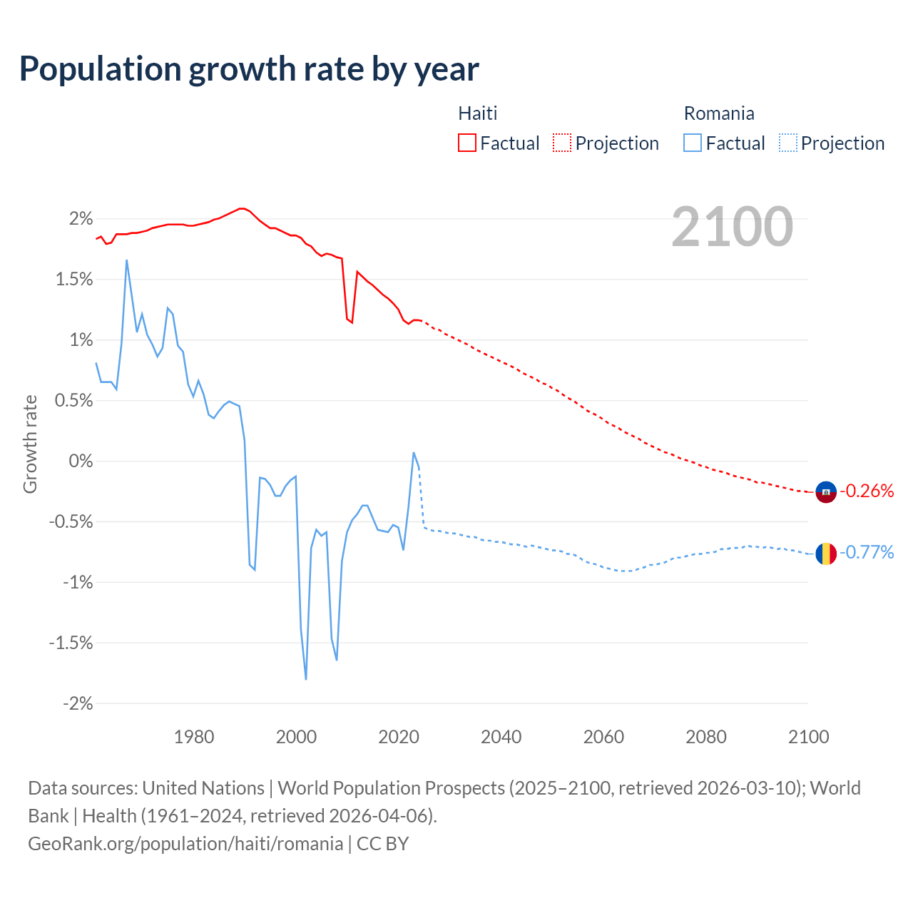- For the last 10 years, Haiti has had an average growth rate of +1.29% per year vs -0.43% in Romania.