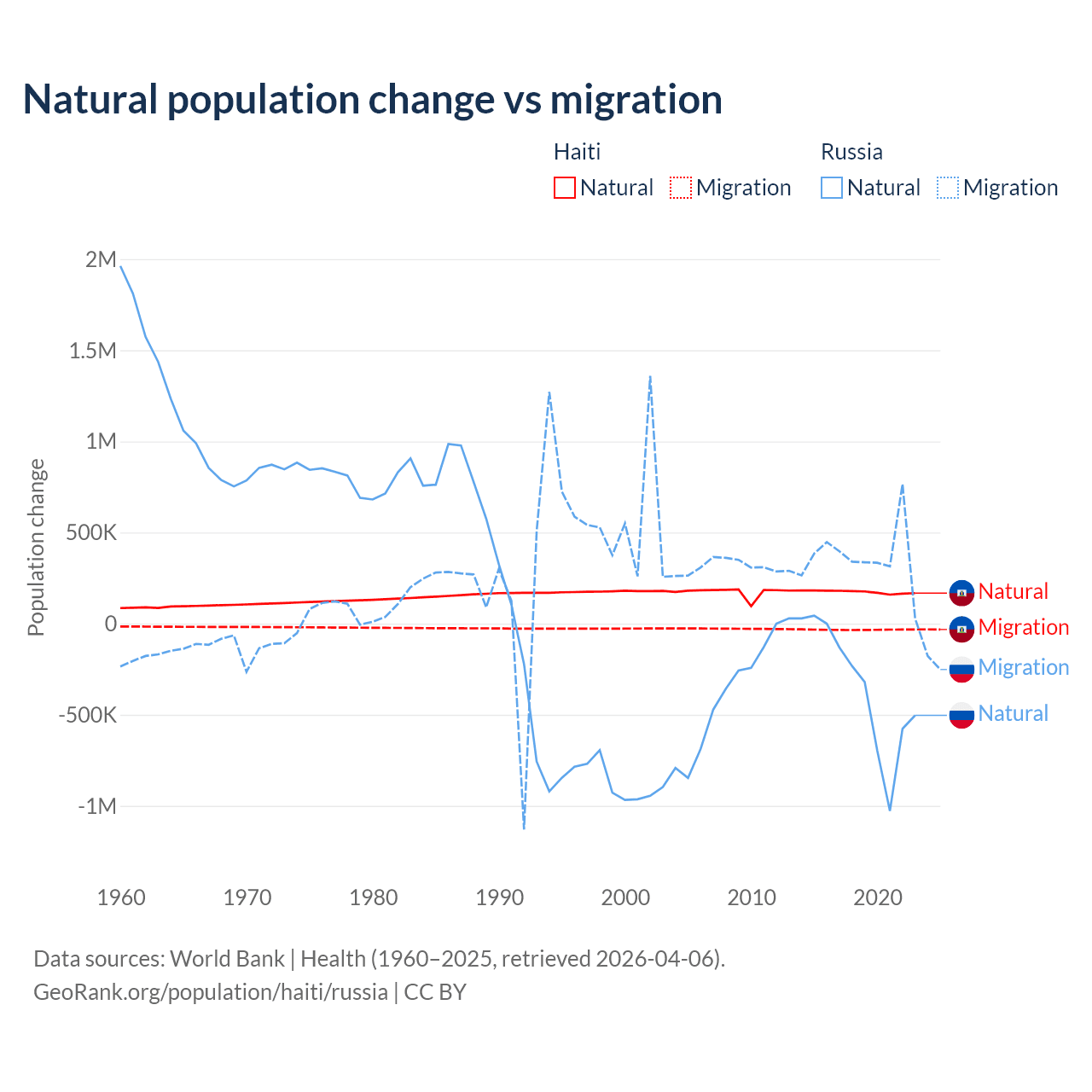 Over the last 10 years, 83.9% of the population change in Haiti is from natural causes (a gain of 1,740,319 people) and 16.1% is from migration (a loss of 333,076 people). In Russia 48.6% is from natural causes (a loss of 3,416,377 people) and 51.4% is from migration (a gain of 3,611,826 people).