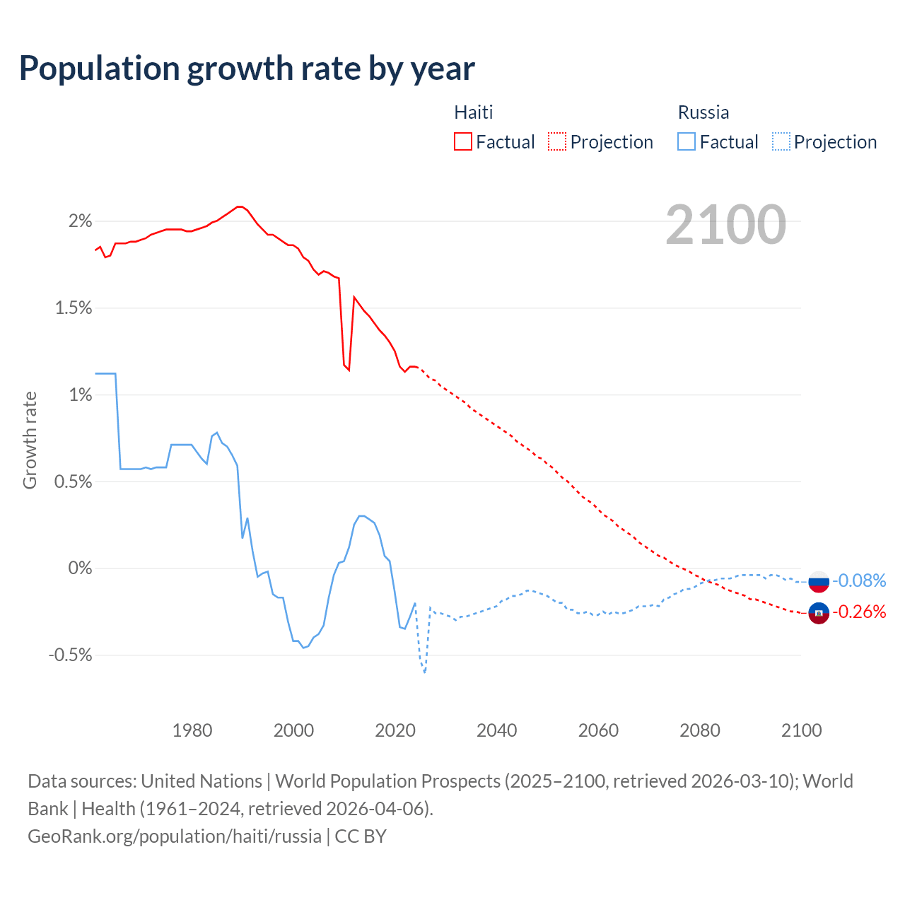 - For the last 10 years, Haiti has had an average growth rate of +1.29% per year vs -0.02% in Russia.