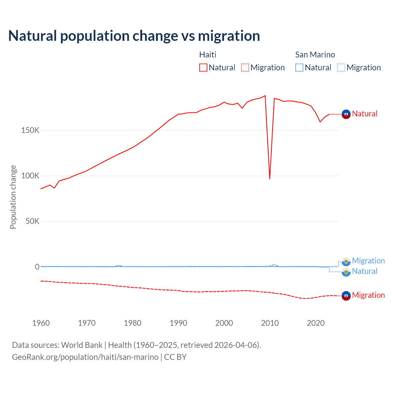 Over the last 10 years, 83.9% of the population change in Haiti is from natural causes (a gain of 1,740,319 people) and 16.1% is from migration (a loss of 333,076 people). In San Marino 40.9% is from natural causes (a loss of 358 people) and 59.1% is from migration (a gain of 517 people).