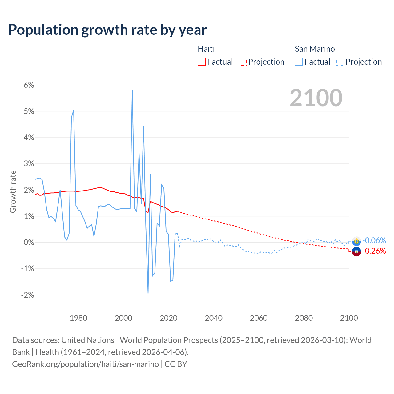 - For the last 10 years, Haiti has had an average growth rate of +1.29% per year vs +0.26% in San Marino.
