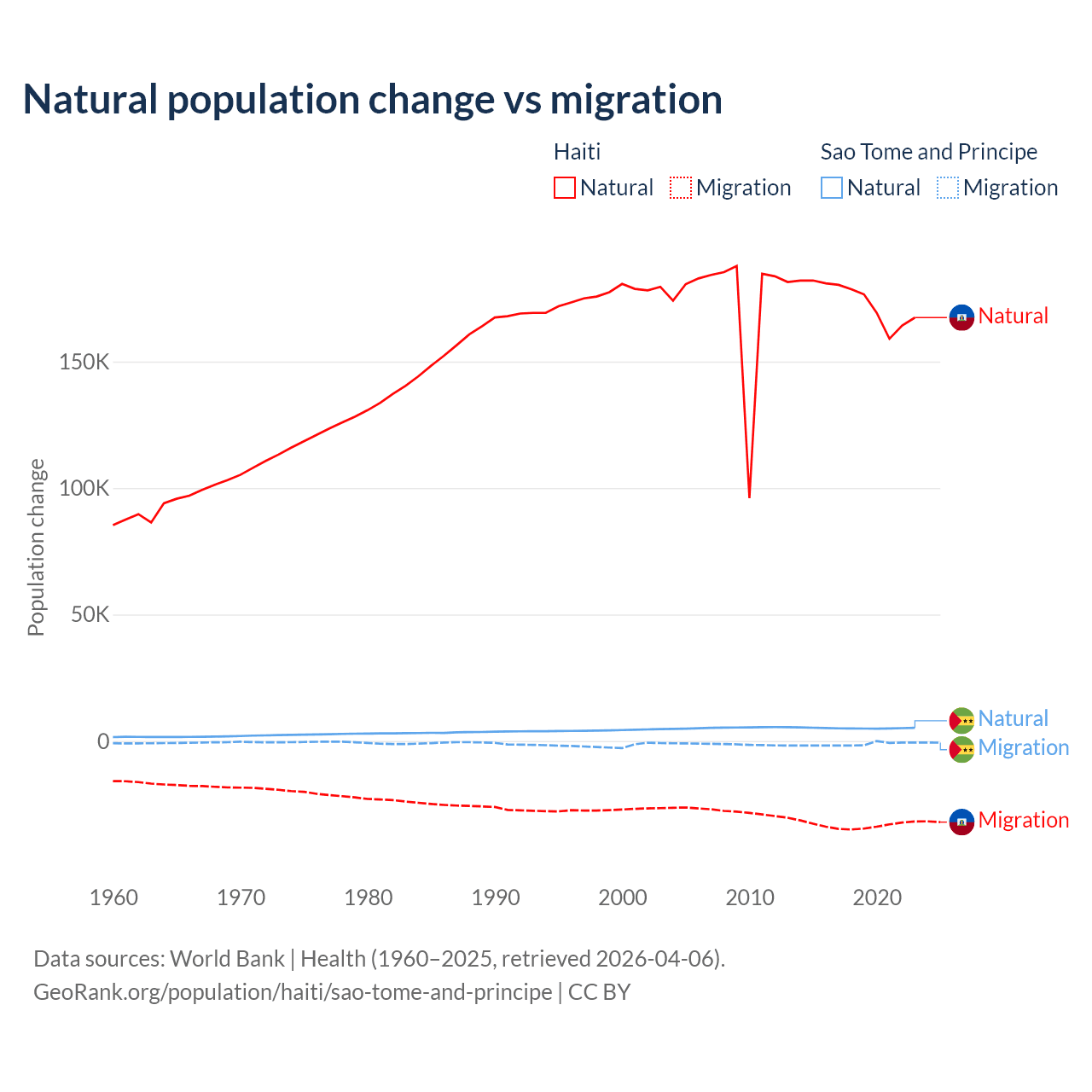 Over the last 10 years, 83.9% of the population change in Haiti is from natural causes (a gain of 1,740,319 people) and 16.1% is from migration (a loss of 333,076 people). In Sao Tome and Principe 80.1% is from natural causes (a gain of 50,822 people) and 19.9% is from migration (a loss of 12,621 people).
