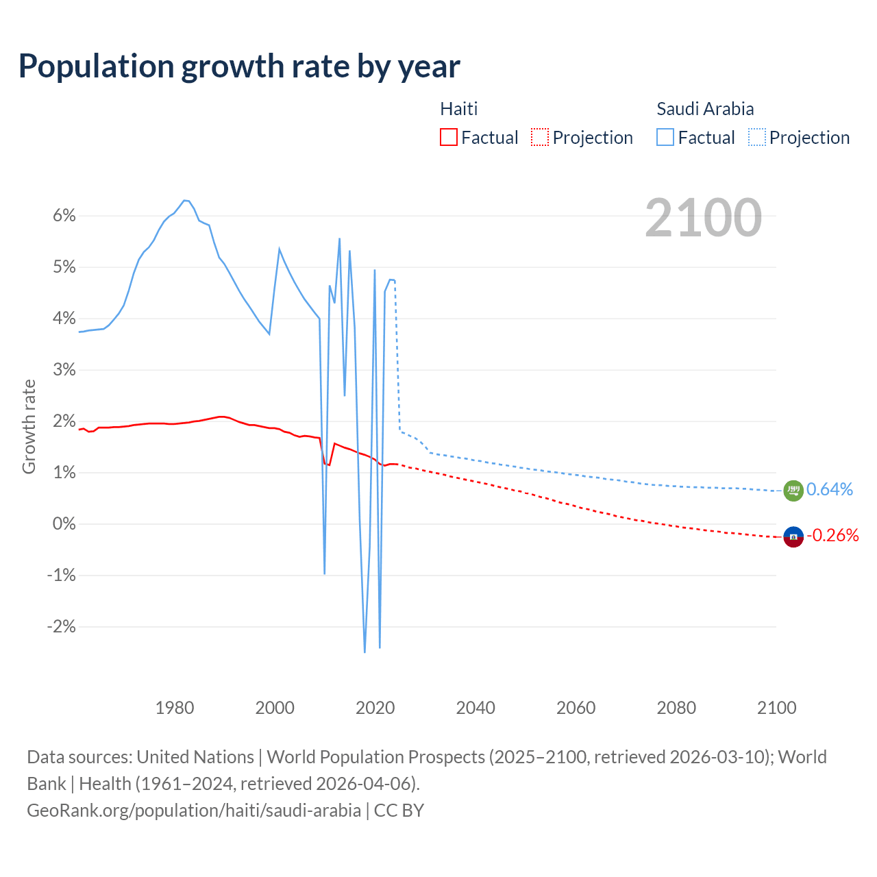 - For the last 10 years, Haiti has had an average growth rate of +1.29% per year vs +2.3% in Saudi Arabia.