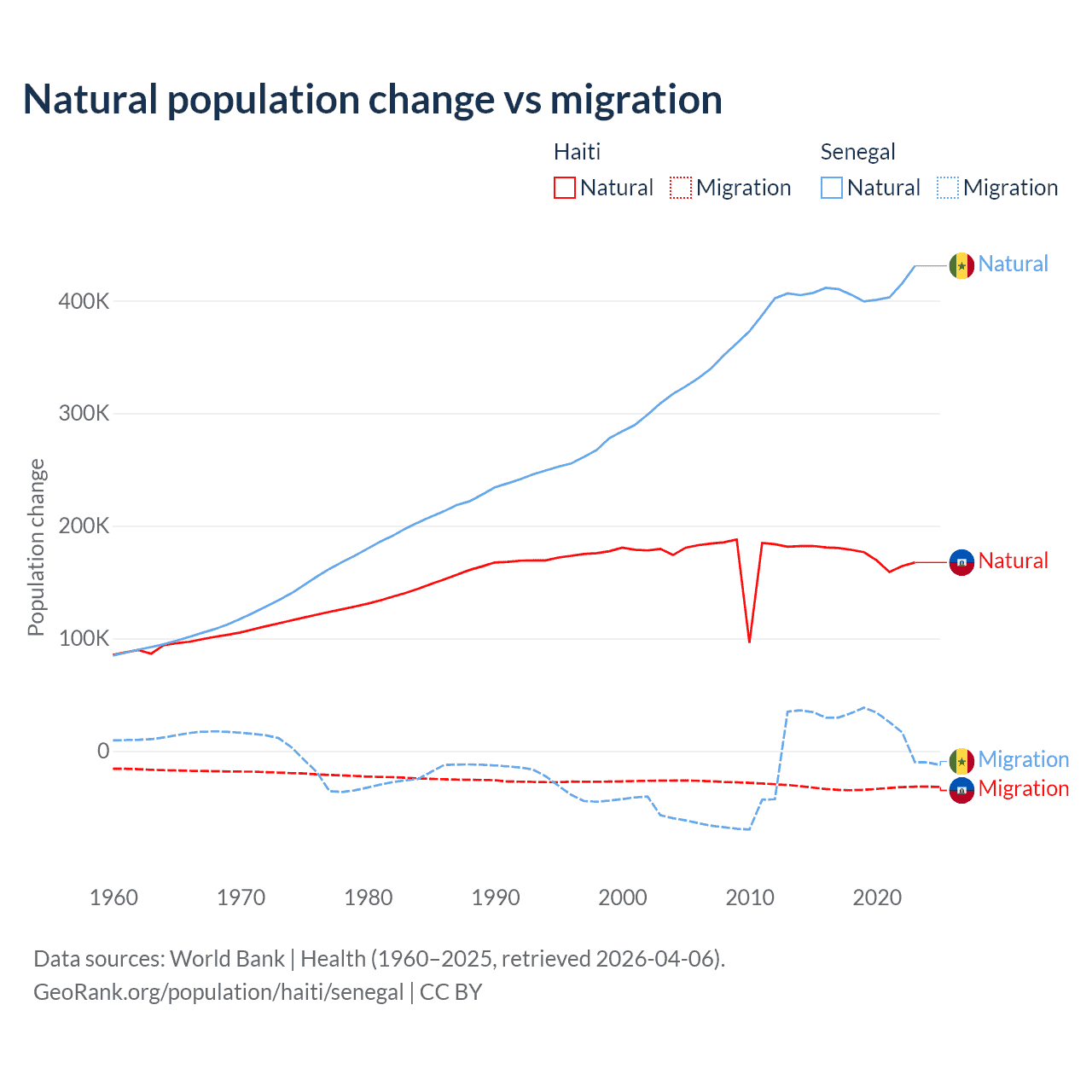Over the last 10 years, 83.9% of the population change in Haiti is from natural causes (a gain of 1,740,319 people) and 16.1% is from migration (a loss of 333,076 people). In Senegal 93.9% is from natural causes (a gain of 4,089,205 people) and 6.13% is from migration (a gain of 267,266 people).