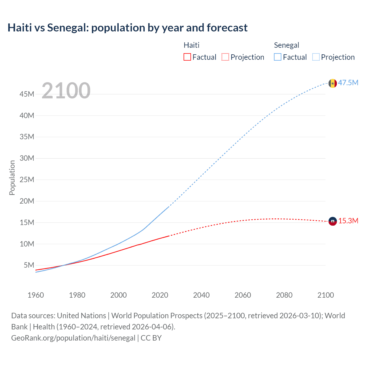 The latest officially reported population of Haiti was 11,772,557 in 2024 vs 18,501,984 people in Senegal in 2024. In 2026, based on the adjusted UN estimation, the current Haiti's population is 12,076,663 people compared to 19,491,599 in Senegal.