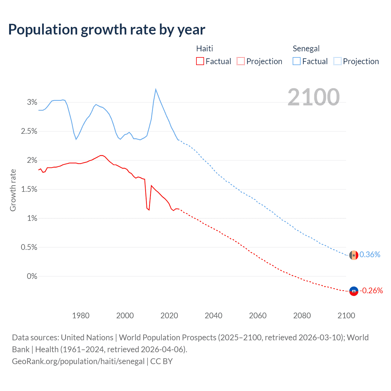 - For the last 10 years, Haiti has had an average growth rate of +1.29% per year vs +2.76% in Senegal.