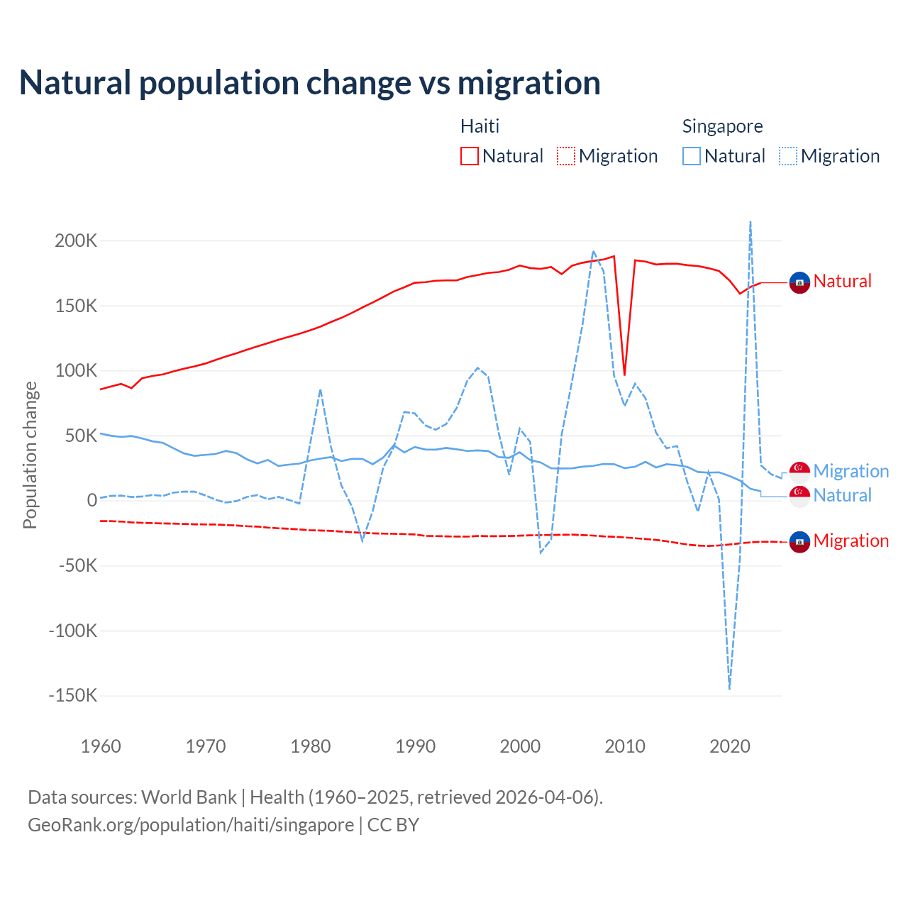 Over the last 10 years, 83.9% of the population change in Haiti is from natural causes (a gain of 1,740,319 people) and 16.1% is from migration (a loss of 333,076 people). In Singapore 54.8% is from natural causes (a gain of 195,953 people) and 45.2% is from migration (a gain of 161,805 people).